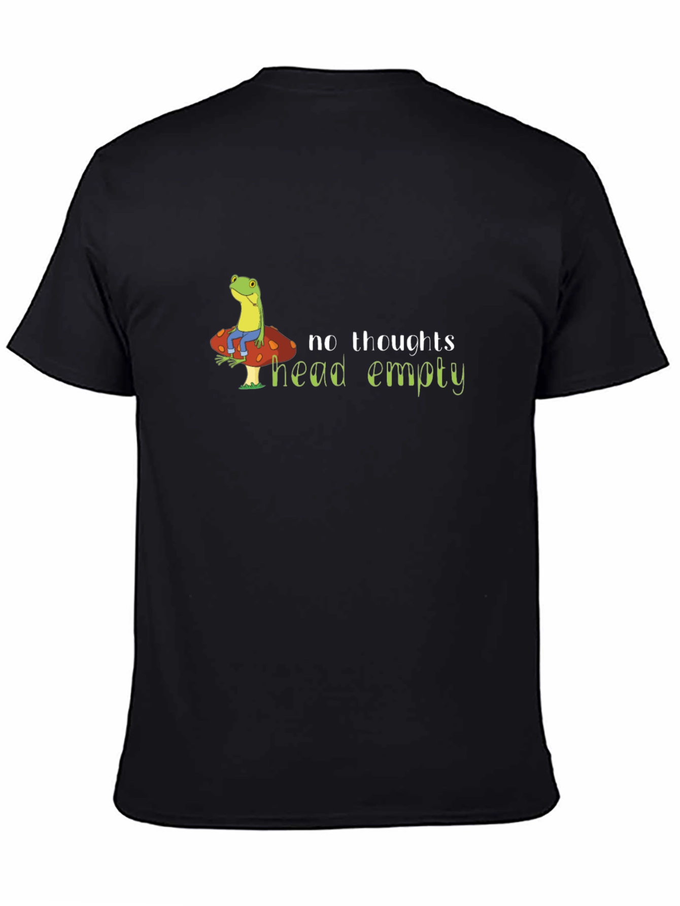 Express your carefree attitude with this unique black t-shirt. Featuring a charming graphic of a frog sitting atop a mushroom, accompanied by the whimsical phrase 'no thoughts head empty,' this tee is perfect for those who embrace a relaxed and lighthearted lifestyle. Made from a soft, comfortable fabric, it offers a great fit for everyday wear. Show off your fun side, whether you're lounging at home, hanging out with friends, or adding a touch of humor to your outfit. A great conversation starter, this shirt is bound to bring smiles and laughter. Get yours today and embrace the empty head!