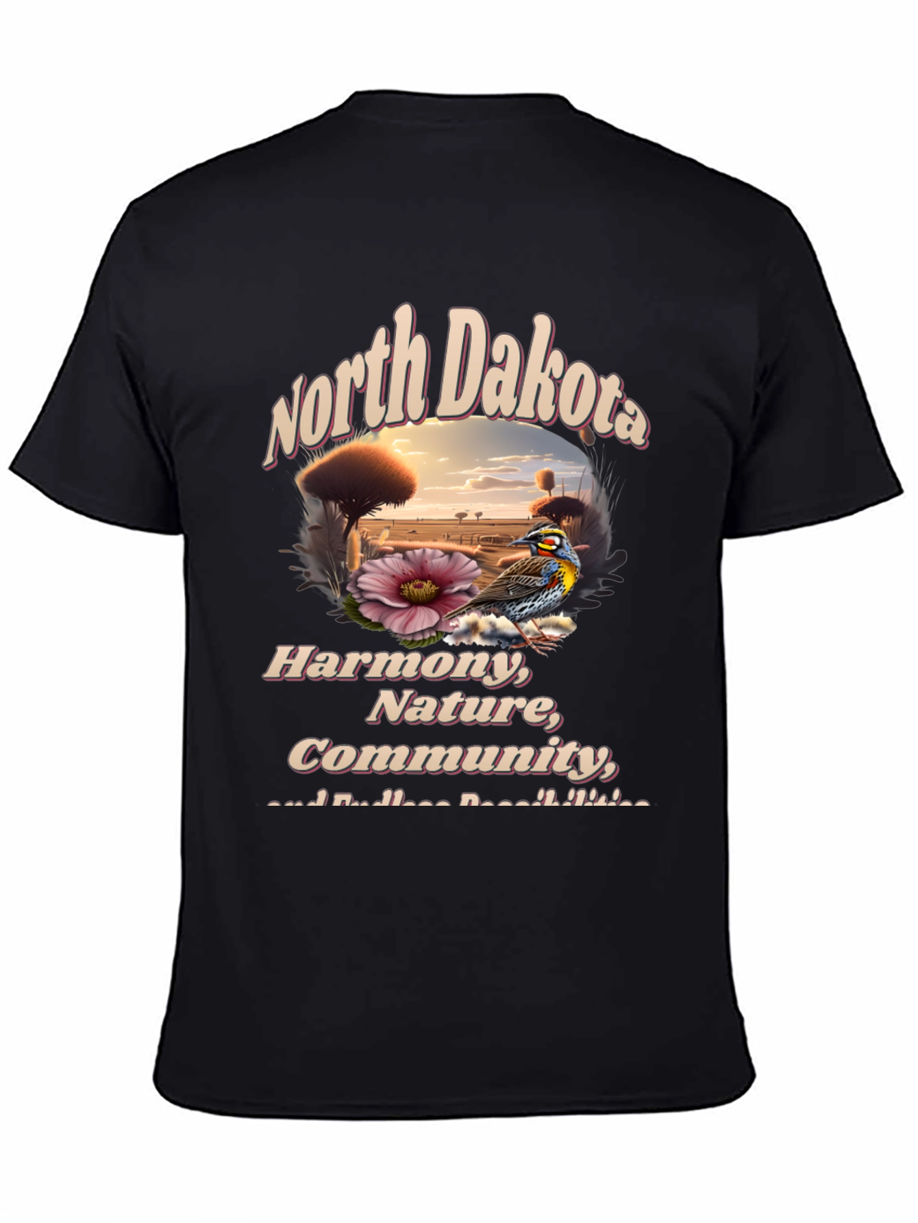 Showcase your love for North Dakota with this unique t-shirt! This black tee features a vibrant design incorporating the words 'North Dakota' along with 'Harmony, Nature, and Community'. The design includes an artistic landscape with native flora and fauna, suggesting a connection to the outdoors and the state's natural beauty. Made from a comfortable fabric, this shirt is perfect for casual wear and expressing your state pride. Ideal for everyday wear, state trips, or as a gift for a North Dakota enthusiast. A stylish and meaningful addition to any wardrobe.