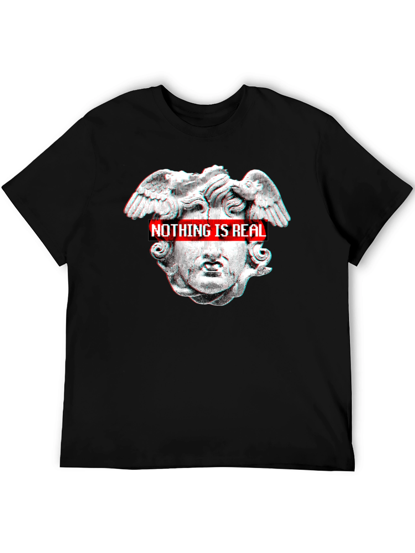 Elevate your casual wardrobe with this unique graphic t-shirt. The black tee features a striking image of a bust with angel wings, distorted with a red and blue glitch effect. A bold red stripe across the image proclaims, "NOTHING IS REAL," adding an edgy, philosophical touch. Crafted from a soft, comfortable fabric, this tee is perfect for everyday wear, making a statement without sacrificing comfort. Pair it with jeans for a relaxed look or dress it up with a blazer for a night out. This eye-catching tee is sure to spark conversations and turn heads wherever you go.