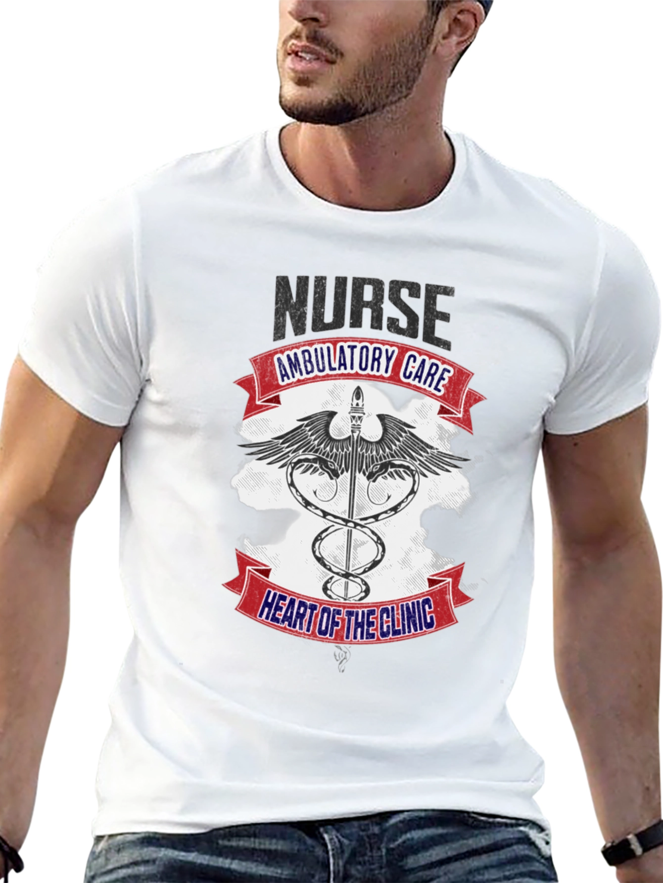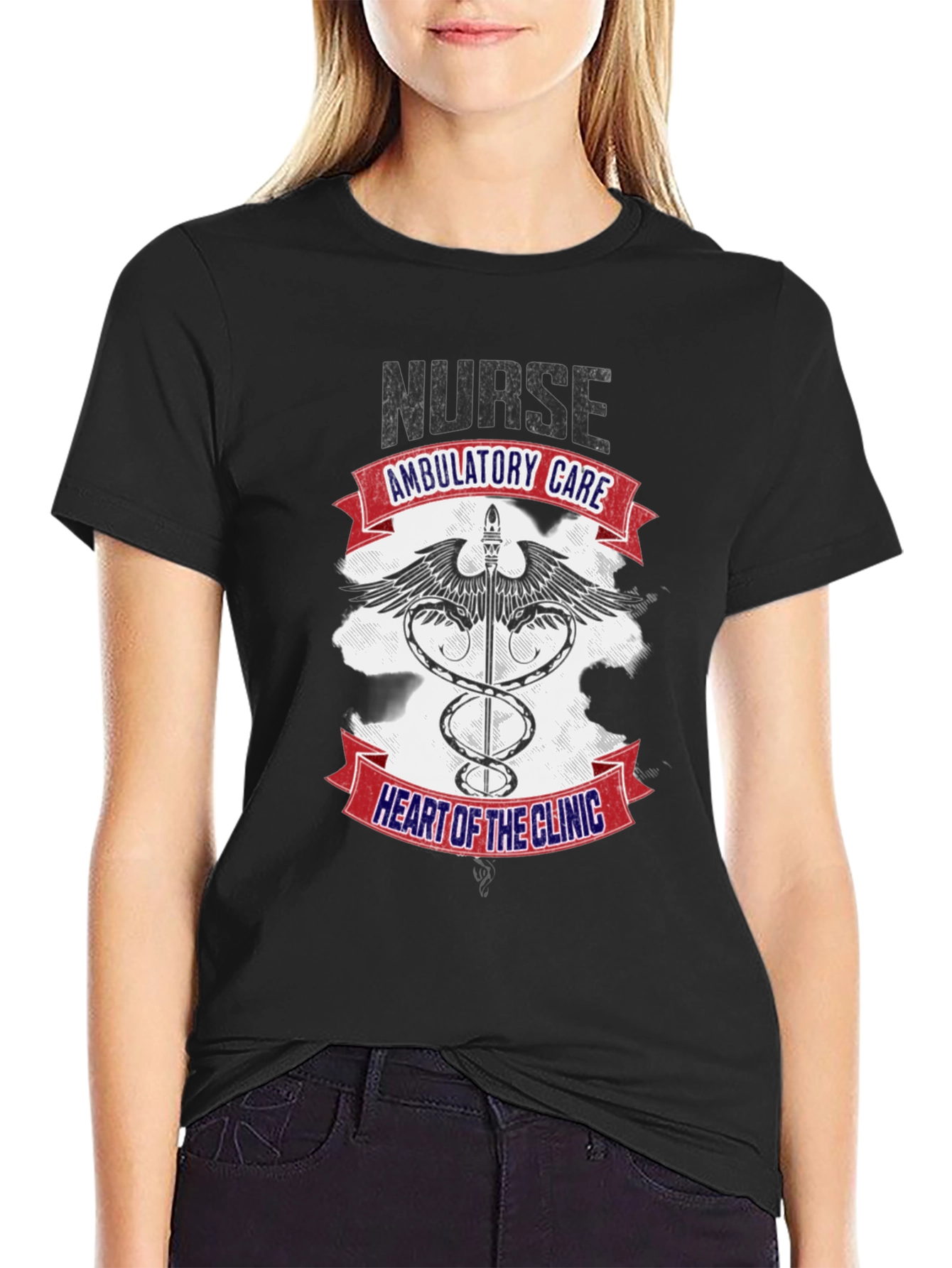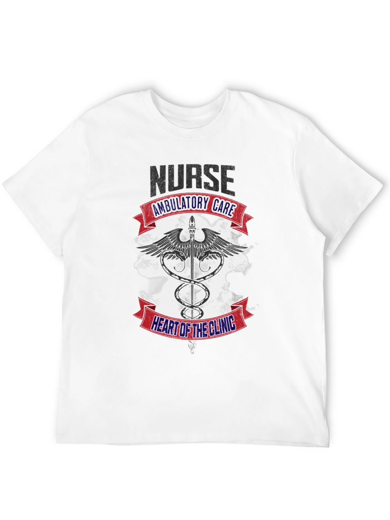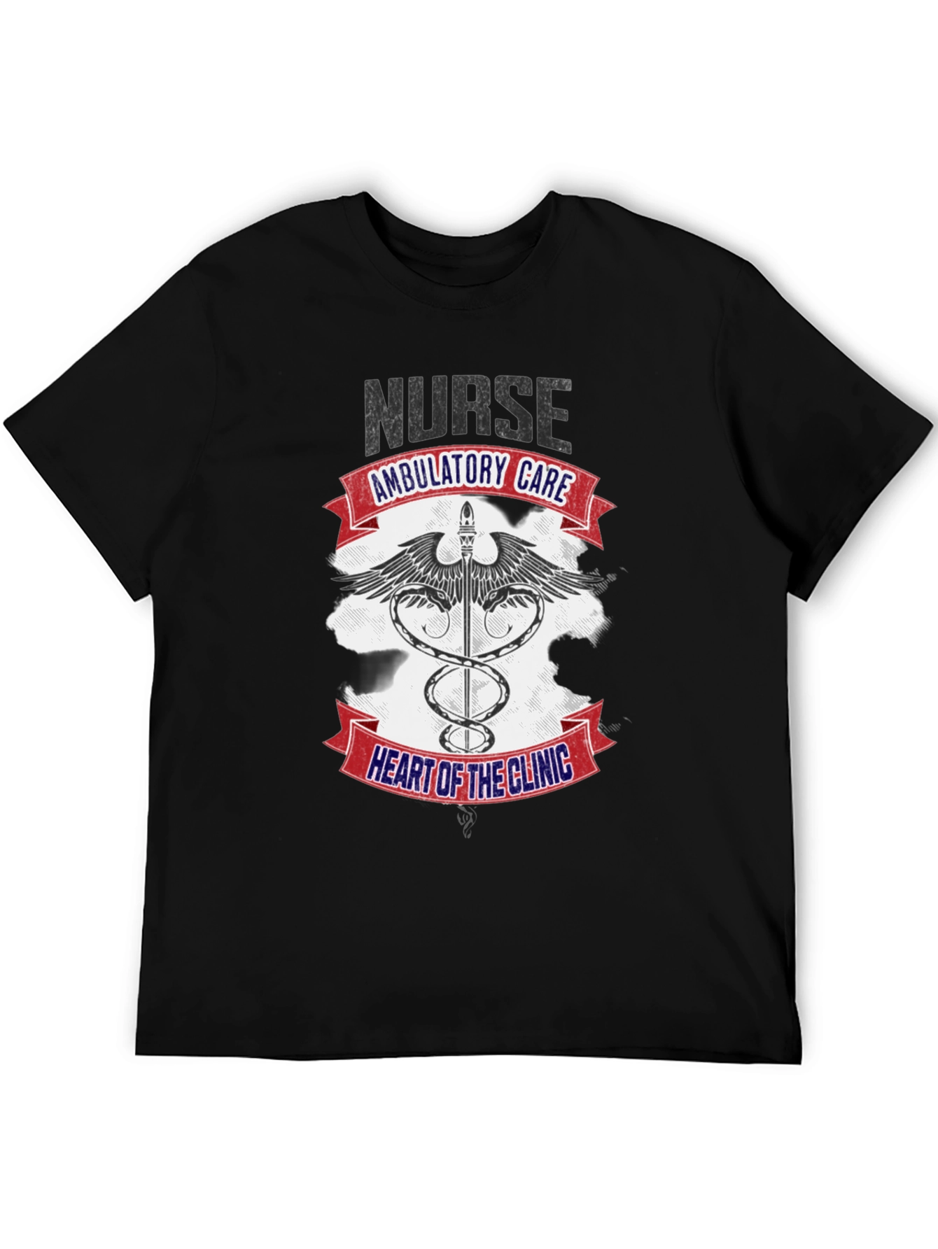 Show off your dedication with this striking black t-shirt! The design features the word "NURSE" above a Caduceus symbol, wings, and the text "AMBULATORY CARE" and "HEART OF THE CLINIC" emblazoned on red and blue banners. It is a casual wear garment for someone in the medical field, perfect for showing pride in your profession both in and out of the clinic. Made from soft, breathable fabric, this shirt offers all-day comfort. Great for nurses, medical staff, or anyone who wants to show support for the healthcare community. Grab yours today and wear your passion!