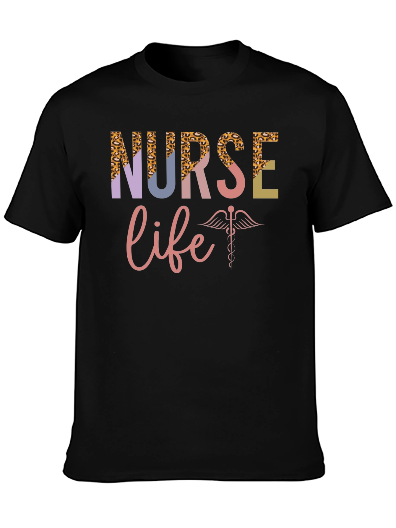 Show your passion for nursing with this stylish 'Nurse Life' t-shirt. This black t-shirt features the word 'NURSE' in an eye-catching mix of leopard print and colorful letters. Below is the word 'life' in a script font, paired with a delicate caduceus symbol. It's made from a soft, comfortable fabric perfect for all-day wear. Ideal for nurses, nursing students, and healthcare professionals. Makes a thoughtful gift for the dedicated nurse in your life. Wear it to work, school, or casual outings to express your pride in your profession!