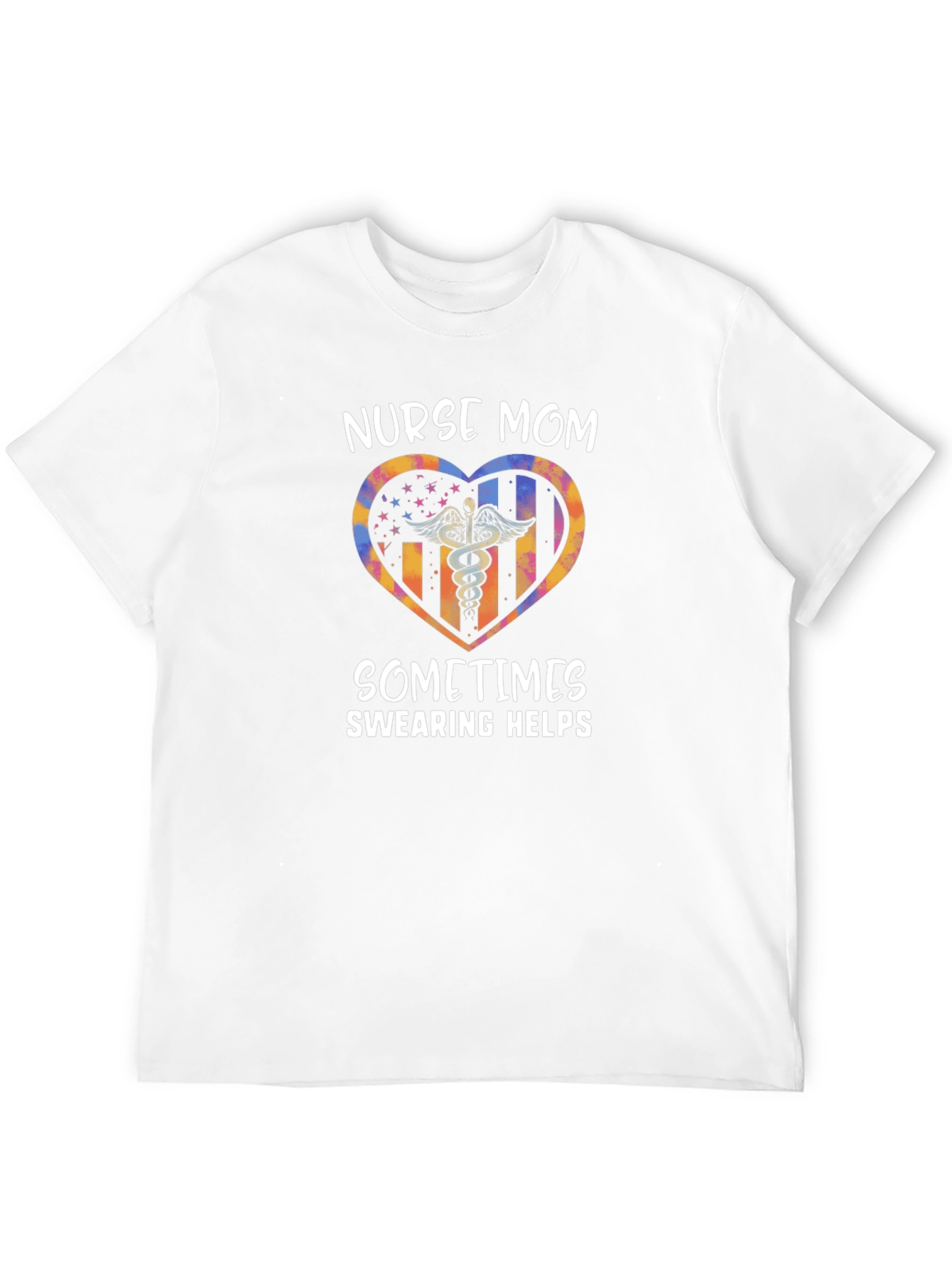 This classic black t-shirt features a bold and humorous graphic design perfect for nurse moms. The design includes the phrase "Nurse Mom" above a heart-shaped American flag with a caduceus symbol in the center. Below, the shirt reads "Sometimes Swearing Helps". Made from a comfortable-looking fabric, this t-shirt would be great for casual wear, work events, or as a gift for the hardworking nurse in your life. Show off your pride and sense of humor with this unique t-shirt, ideal for those long shifts or just relaxing at home.