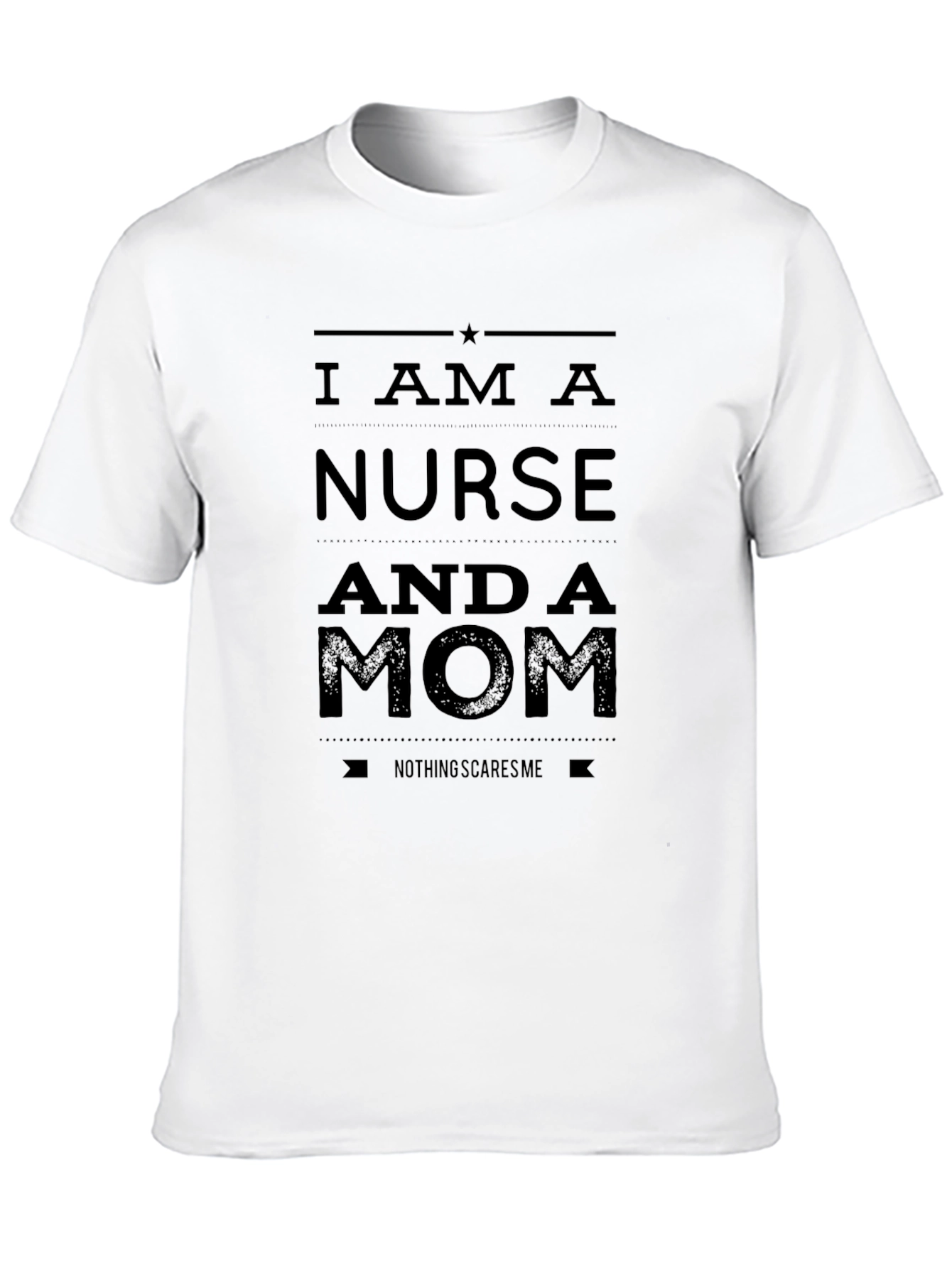 Show off your strength with this bold black T-shirt. The design proudly proclaims "I AM A NURSE AND A MOM," and under that it says “NOTHING SCARES ME”. This tee is perfect for everyday wear, crafted for comfort and style. It's an ideal gift for the superwoman in your life who balances caring for patients and raising children with unwavering strength. Wear it to work, casual outings, or as a statement piece showcasing your incredible dedication and resilience. This T-shirt is more than just clothing; it's a tribute to the fearless nurse moms of the world.