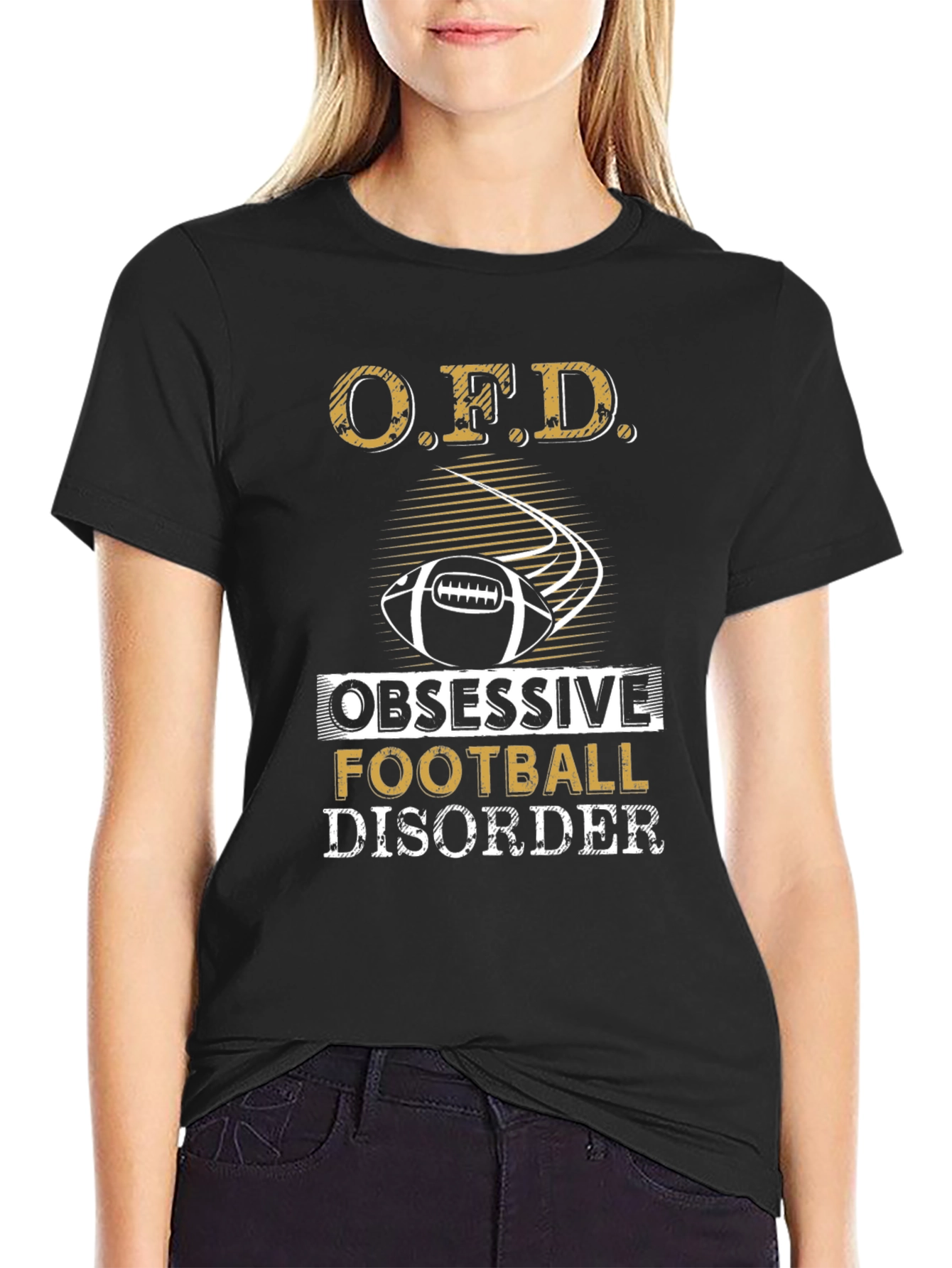 Show off your love for football with this unique graphic tee! The black t-shirt features the phrase "O.F.D. Obsessive Football Disorder" along with a football graphic. The design combines distressed gold and white fonts for a vintage, sporty look. Made from a comfortable, breathable fabric, this tee is perfect for game days, casual outings, or just lounging around while watching your favorite team. Express your passion for the game with this stylish and eye-catching t-shirt. A must-have for any true football fanatic's wardrobe!
