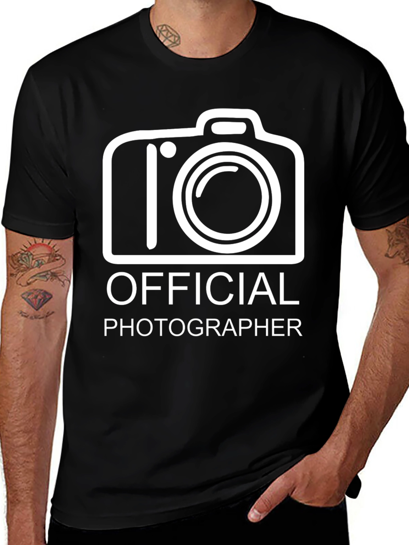 Show off your passion for photography with this classic black t-shirt. The bold, white graphic features a stylized camera above the words 'OFFICIAL PHOTOGRAPHER,' making it a perfect statement piece for photo enthusiasts and professionals alike. This tee is made from a soft, comfortable fabric, ideal for everyday wear. Whether you're out on a photoshoot, attending a photography event, or just want to showcase your love for the art, this t-shirt is a great addition to your wardrobe. Its simple design makes it versatile enough to pair with jeans, shorts, or your favorite casual attire. Get yours today and let everyone know you're the official photographer!