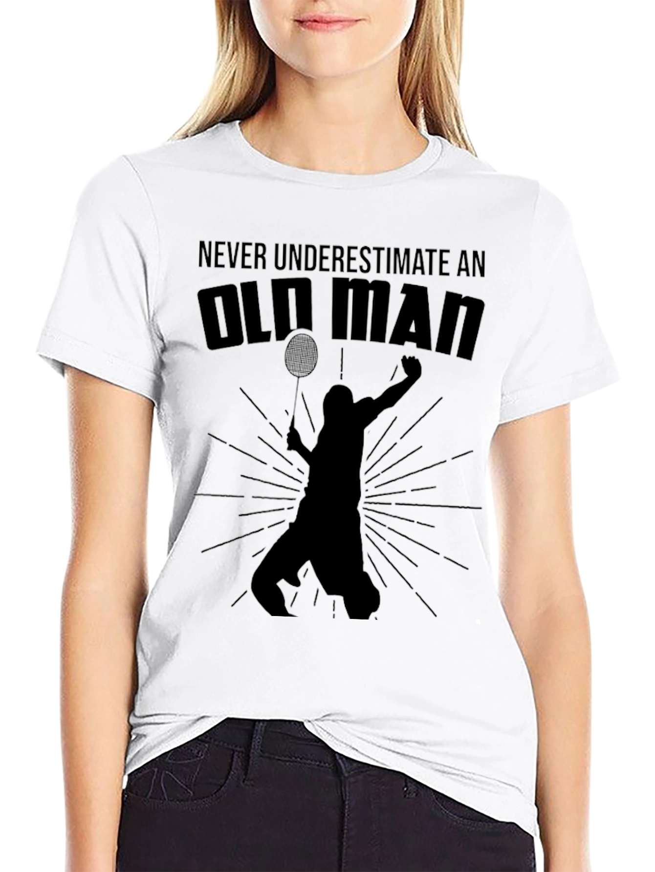 Showcase your love for badminton with this unique graphic t-shirt. Made from comfortable fabric, this black tee features a silhouette of a badminton player with the saying "Never Underestimate an Old Man". The design adds a sporty and humorous touch, making it a great conversation starter. Ideal for casual wear, sports events, or as a gift for the badminton enthusiast in your life. Wear it to your next game or while hanging out with friends to express your passion for the sport.