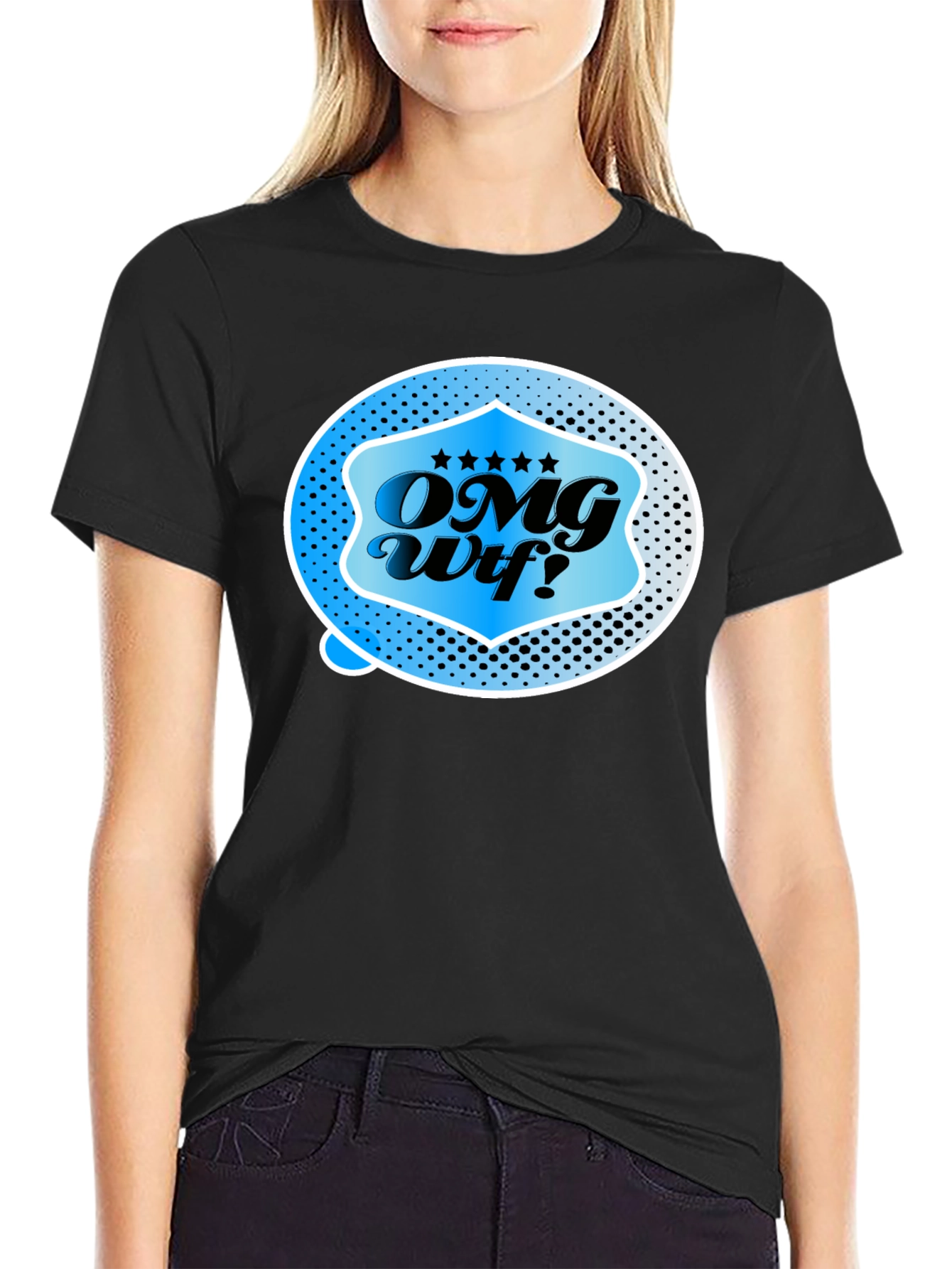 Express yourself with this eye-catching black graphic tee. The shirt features a unique design with the text "OMG Wtf!" inside a stylized blue frame with star accents. The design is modern and the colors are bold. Made from a comfortable fabric, this t-shirt is perfect for casual wear, social gatherings, or simply expressing your personality. Its versatile style makes it easy to pair with jeans, shorts, or your favorite bottoms. Show off your fun and quirky side with this statement piece!
