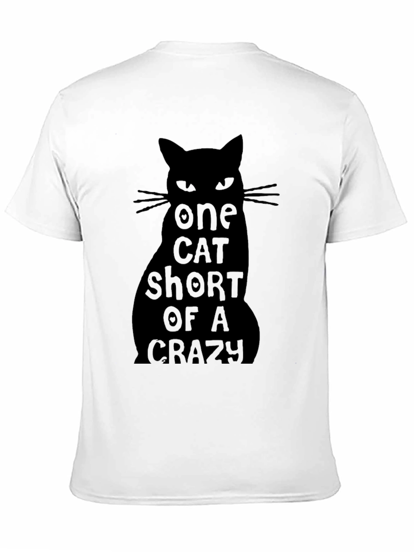 Show off your love for felines with this unique black t-shirt! Featuring a bold, silhouette of a cat and the amusing phrase 'One Cat Short of a Crazy', this tee is sure to turn heads and spark conversations. Made from a soft, comfortable fabric, it's perfect for everyday wear. Dress it up with a blazer or keep it casual with jeans – either way, you'll be making a statement. A must-have for any cat lover with a sense of humor. It's perfect for casual outings, cat cafes, or lounging at home with your furry friends.
