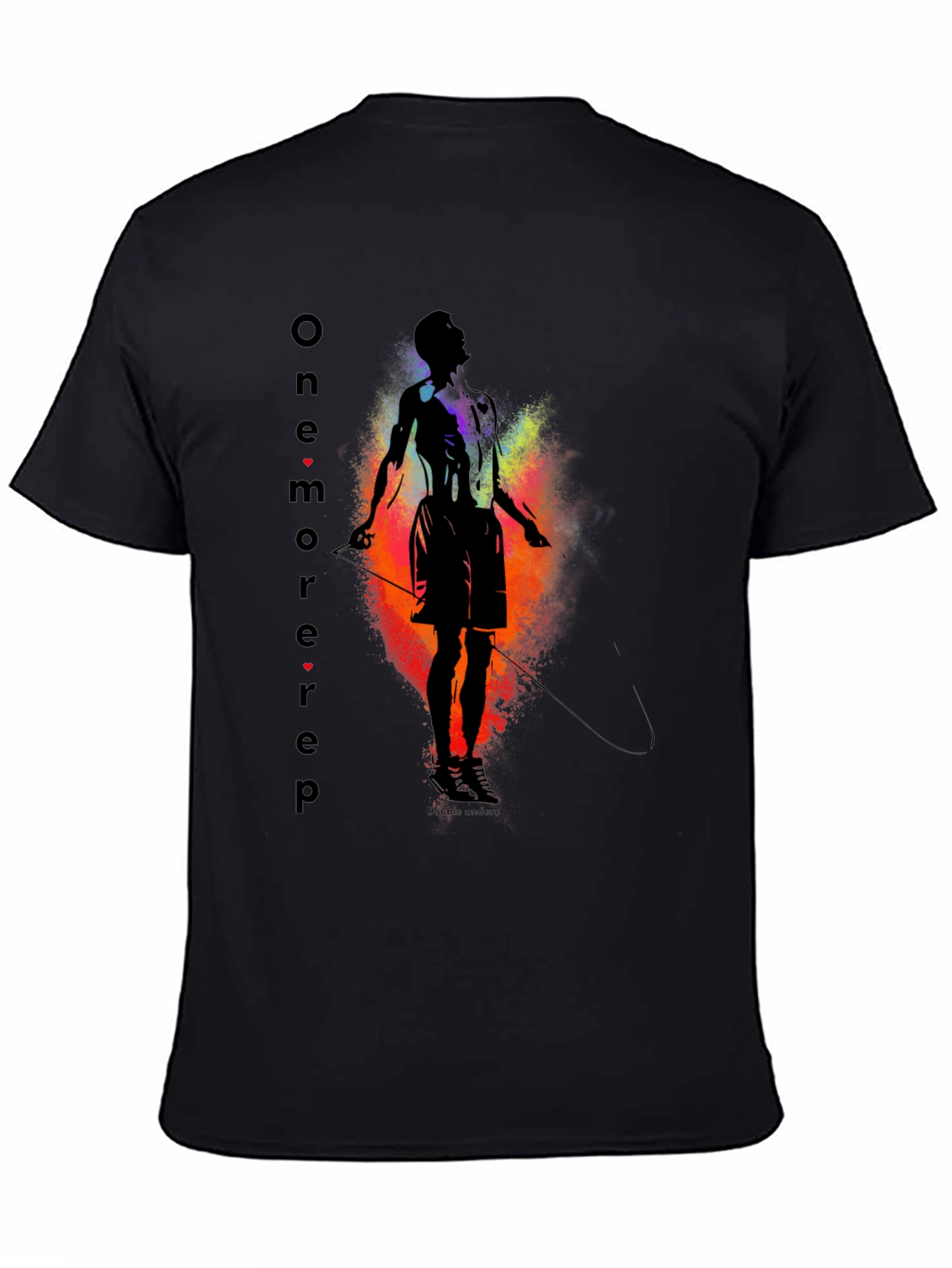 Elevate your workout style with this bold, black graphic tee. The vibrant design features a silhouette of an athlete with a jump rope, exploding with color. The words "One more rep" are printed along the side. Made from a soft, breathable fabric, this shirt provides ultimate comfort during intense training sessions or casual wear. Show off your dedication and stay motivated with this statement piece. Perfect for fitness enthusiasts.