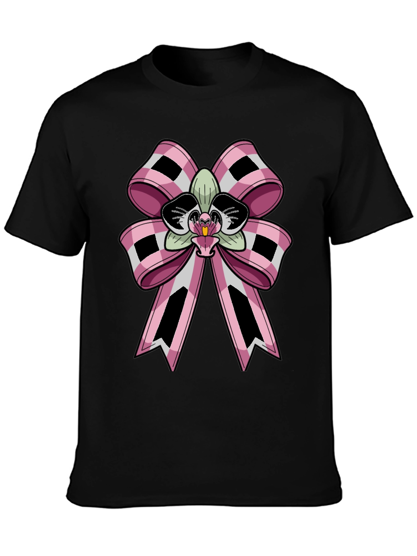 Show your unique style with this eye-catching t-shirt! This bold, black tee features a striking graphic of an orchid-centered bow tie with pink ribbons and black accents. The design is sure to grab attention and add a touch of playful sophistication to any outfit. Made from soft, breathable cotton, this t-shirt is comfortable enough for everyday wear. Dress it up with a blazer or keep it casual with jeans – this versatile tee is perfect for expressing your personality. A great gift for fans of unique designs and those who love to make a statement.