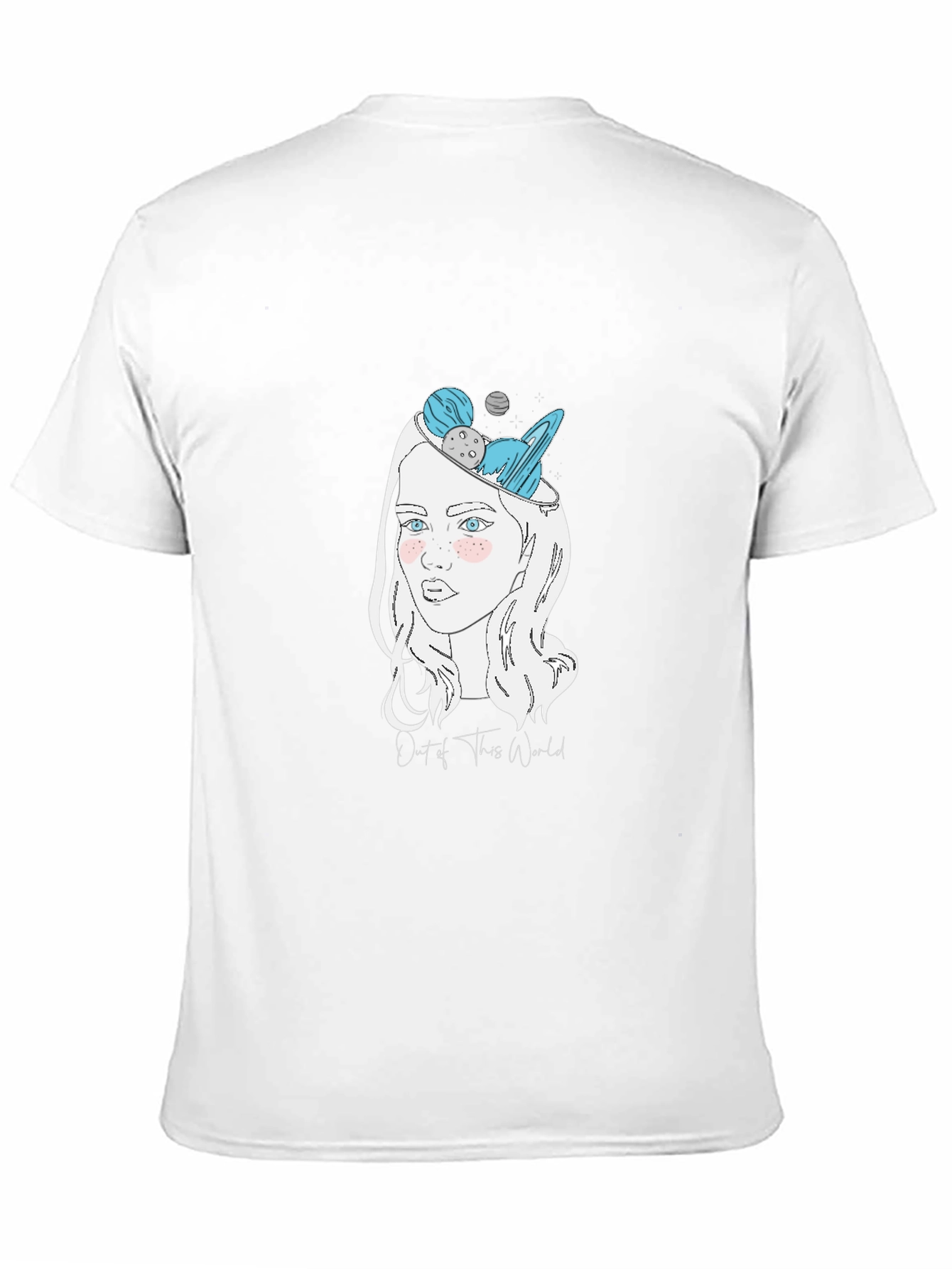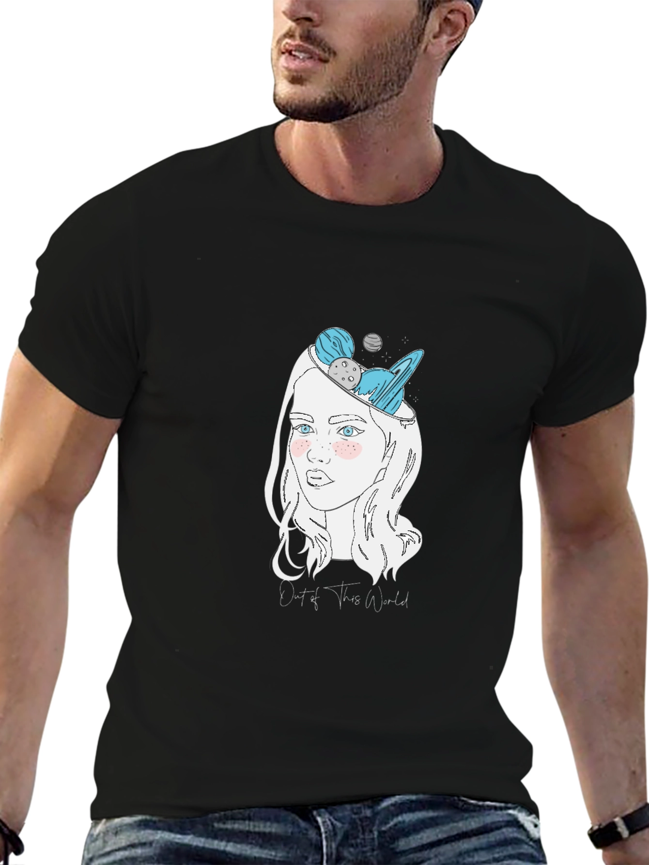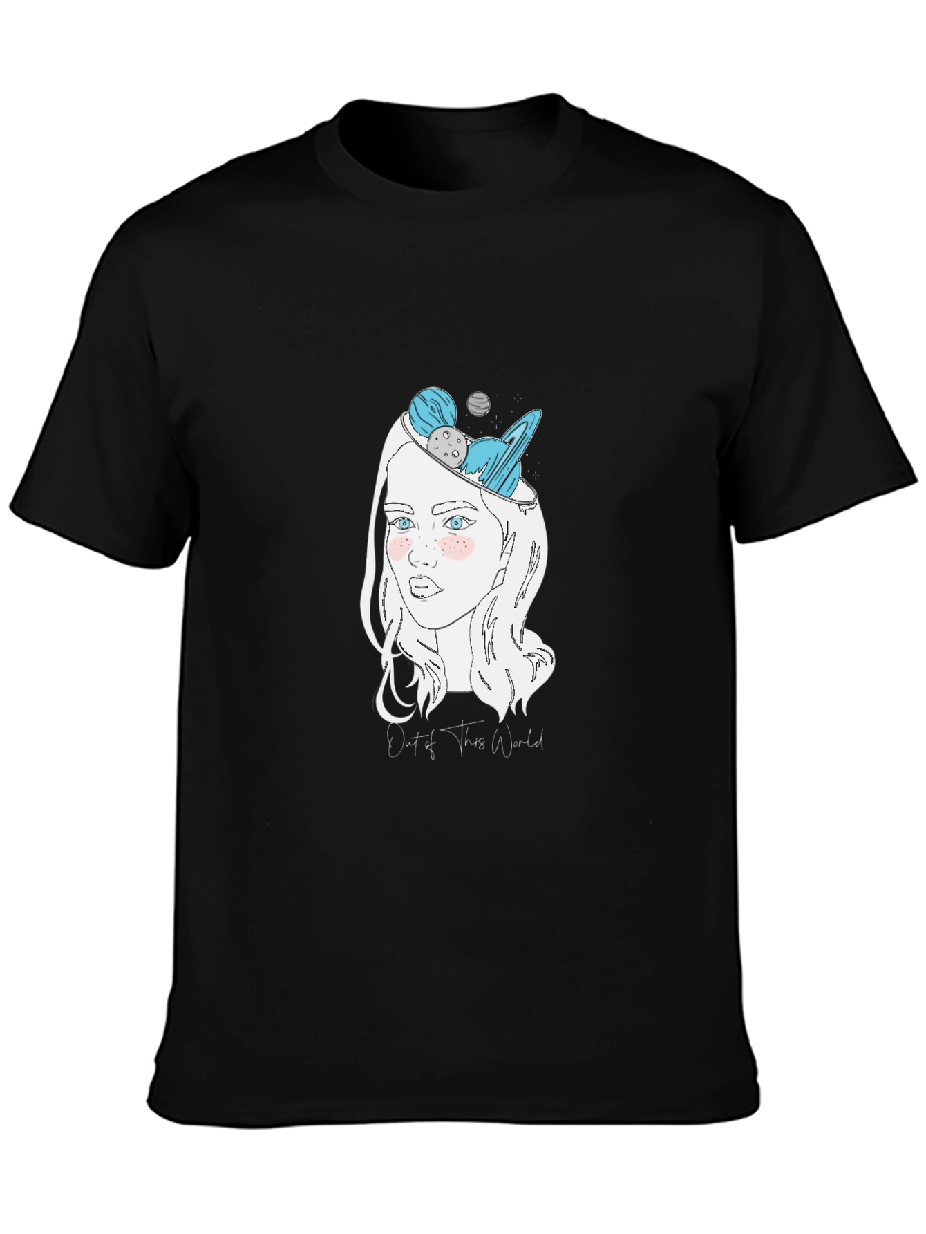 Express your unique style with this black graphic t-shirt. Featuring a stylized drawing of a woman, her head imaginatively filled with planets, stars and the phrase “Out of This World”. This soft and comfortable tee is made from a breathable fabric blend, ensuring all-day comfort. The eye-catching design is perfect for casual wear, making a statement wherever you go. This t-shirt is an ideal choice for anyone who loves astronomy, art, or simply wants to showcase their individuality. Add this unique piece to your wardrobe and let your imagination shine!