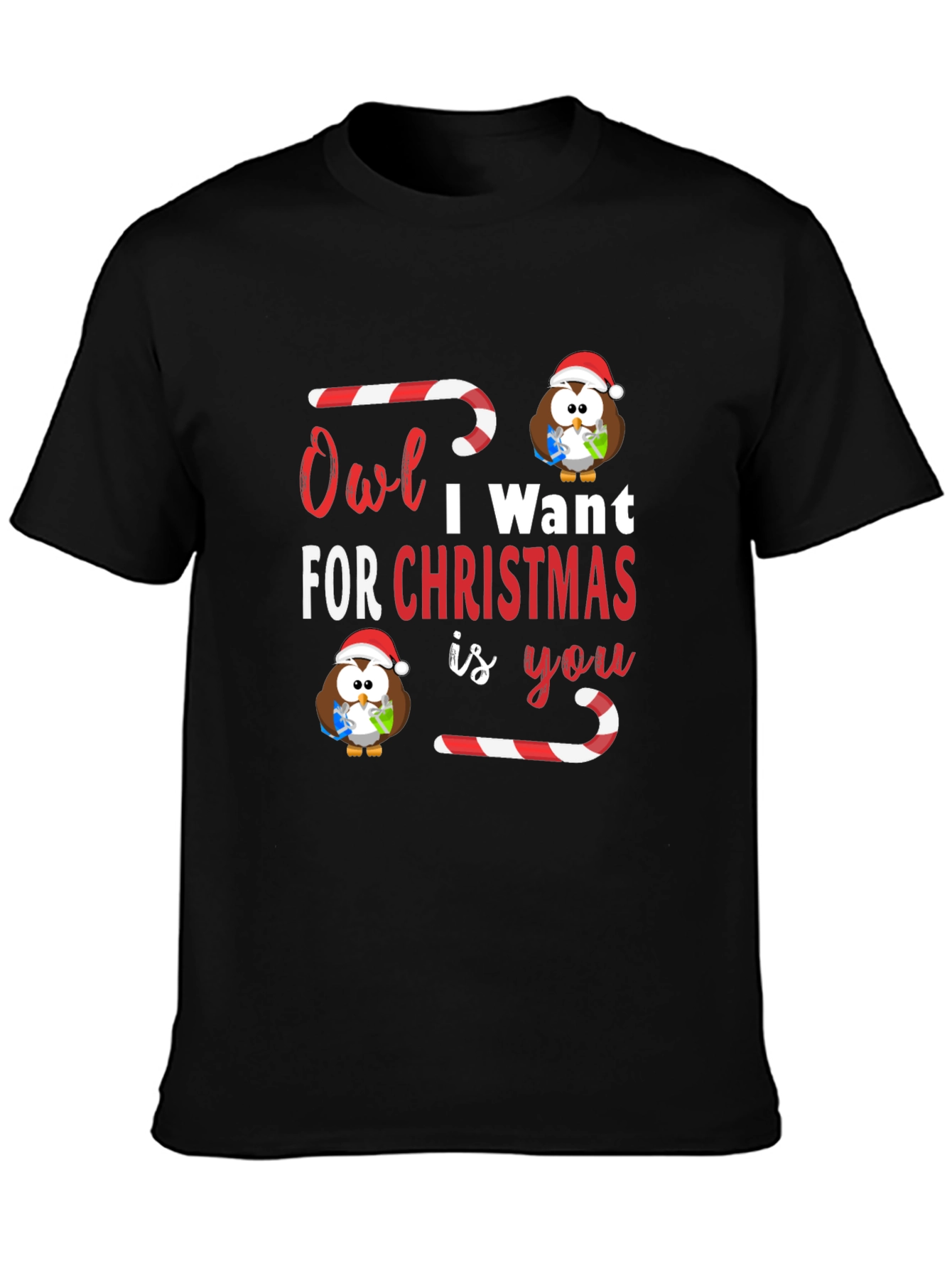 Spread holiday cheer with this adorable 'Owl I Want For Christmas' T-shirt! This black tee features a festive design with cute owls wearing Santa hats and holding gifts, paired with candy cane accents. The playful typography adds a touch of whimsy. Made from a comfortable, breathable fabric, this shirt is perfect for holiday parties, family gatherings, or cozy nights in. Show off your love for owls and the holiday season with this unique and eye-catching tee. A perfect gift for owl lovers and Christmas enthusiasts alike!