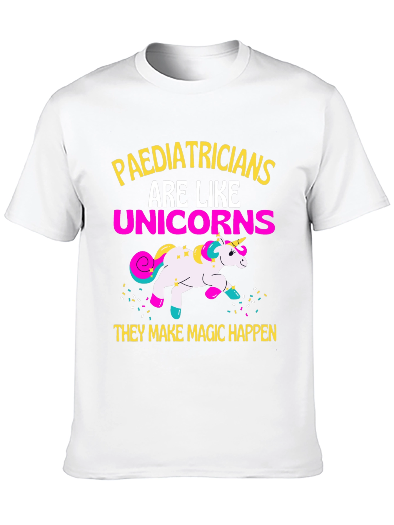 This eye-catching black t-shirt features a fun and whimsical design, perfect for paediatricians or anyone who appreciates a touch of magic! The shirt displays the text 'PAEDIATRICIANS ARE LIKE UNICORNS' in vibrant yellow and pink lettering, complemented by an adorable unicorn graphic. Below the unicorn, the text 'THEY MAKE MAGIC HAPPEN' adds a playful touch. Made from a comfortable-looking fabric, this tee is ideal for casual wear, work events, or as a thoughtful gift for your favorite paediatrician. Show your appreciation for these magical healers with this unique and stylish t-shirt.