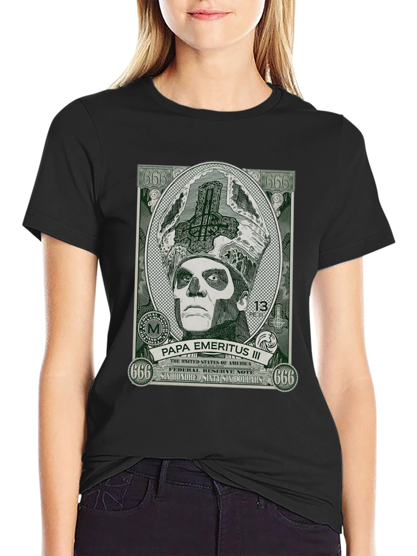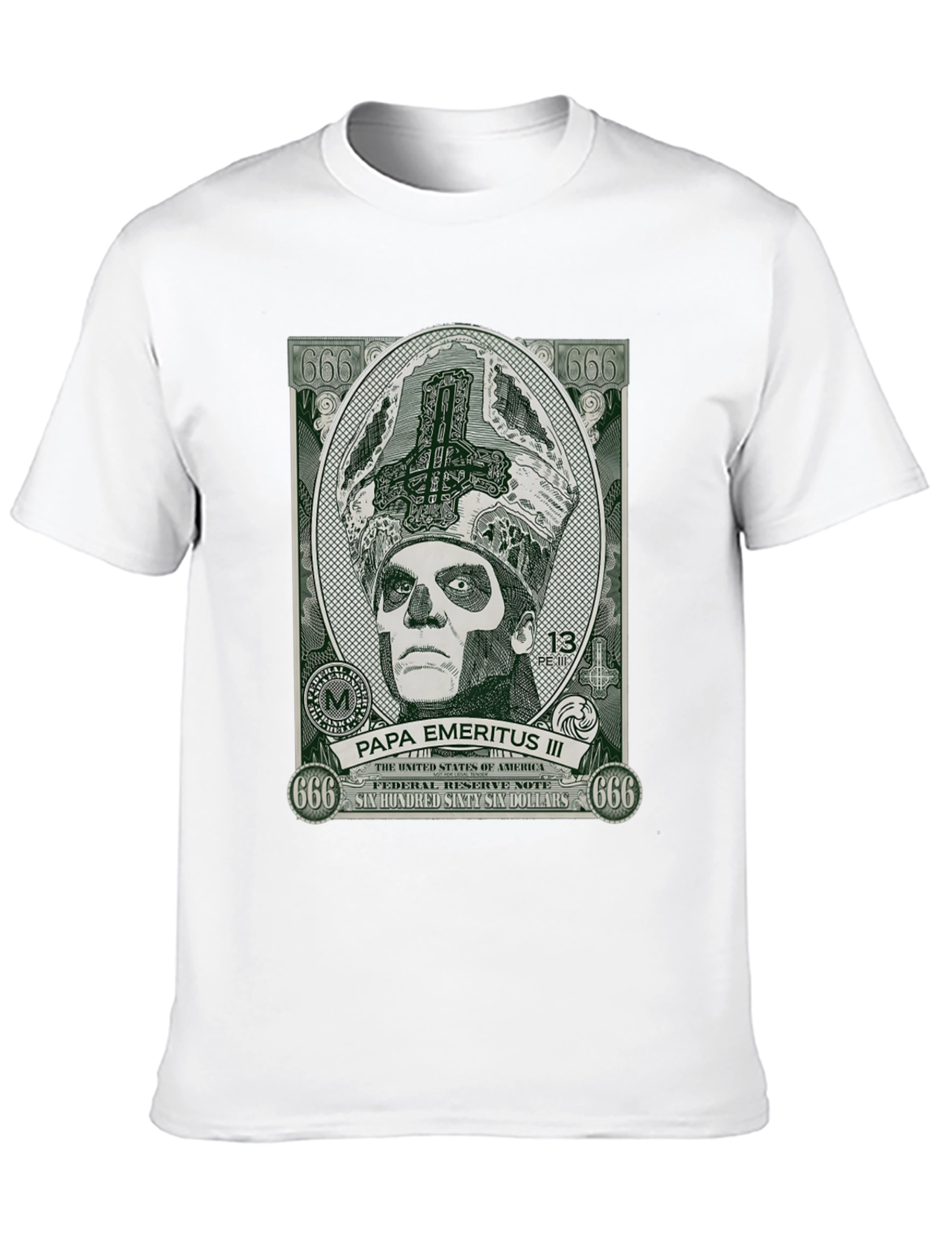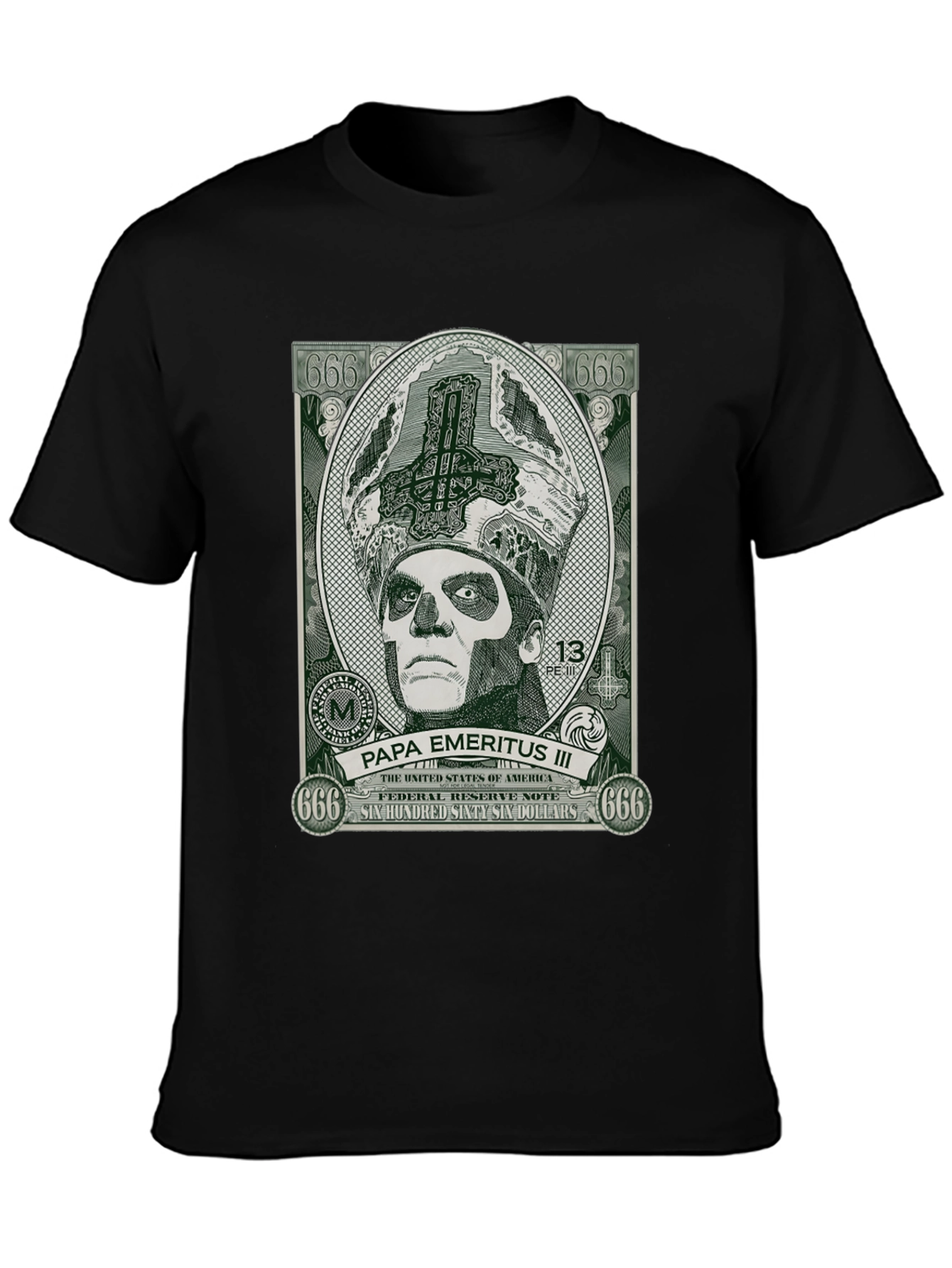 Show off your love for the iconic Ghost band with this striking black T-shirt. The shirt features a unique graphic of Papa Emeritus III designed like a dollar bill. The design includes symbolic elements such as "666" and the phrase "Six Hundred Sixty Six Dollars". Ideal for concerts, casual wear, or as a gift for a Ghost fan. Made from comfortable materials.