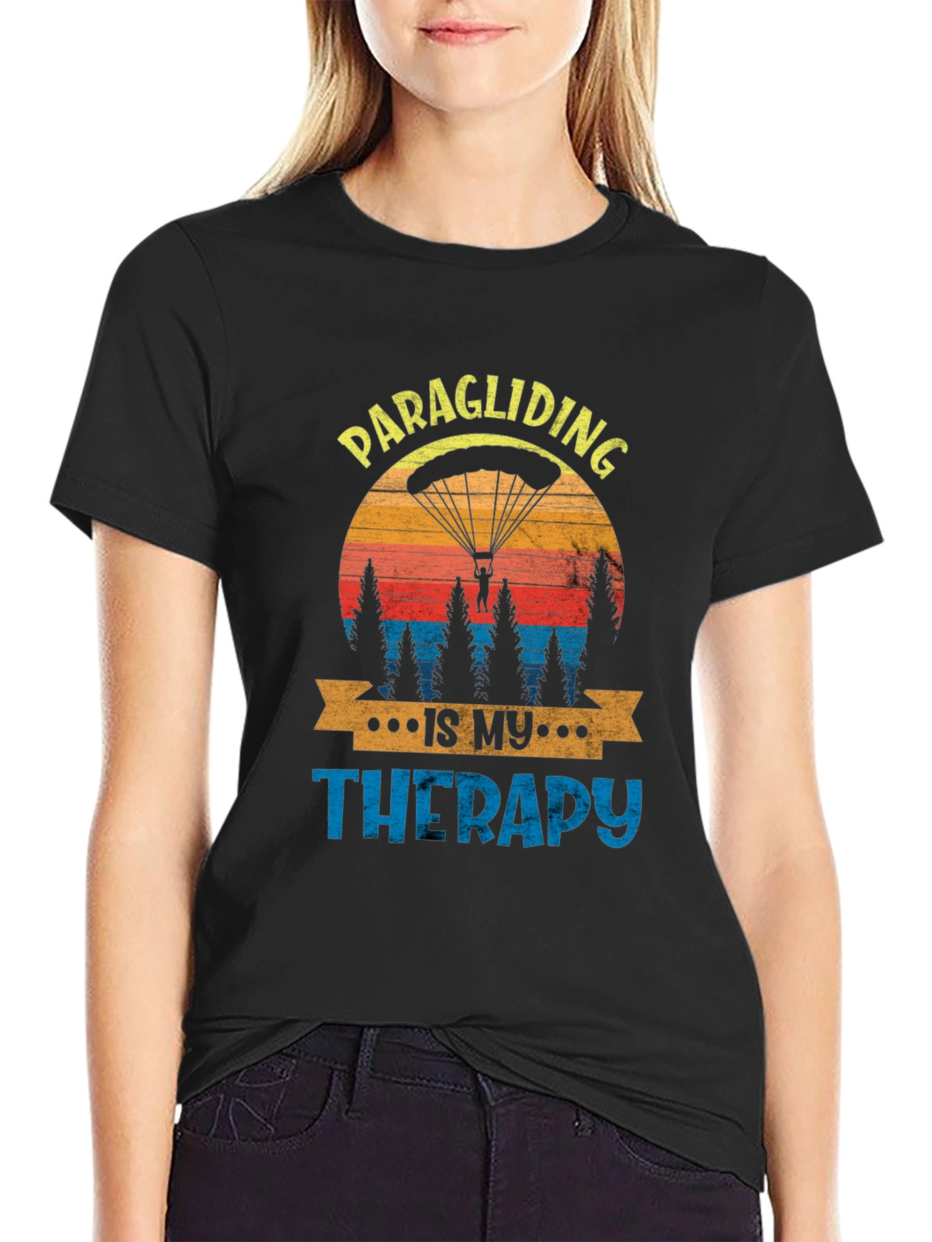 This stylish black t-shirt features a vibrant graphic design that celebrates the thrill of paragliding. The design showcases a paraglider silhouette against a retro-style sunset backdrop, complete with pine trees and the text "PARAGLIDING IS MY THERAPY" in eye-catching fonts. Made from comfortable fabric, this tee is perfect for everyday wear, outdoor adventures, or as a statement piece for paragliding enthusiasts. Show off your passion for soaring through the skies with this unique and expressive t-shirt.