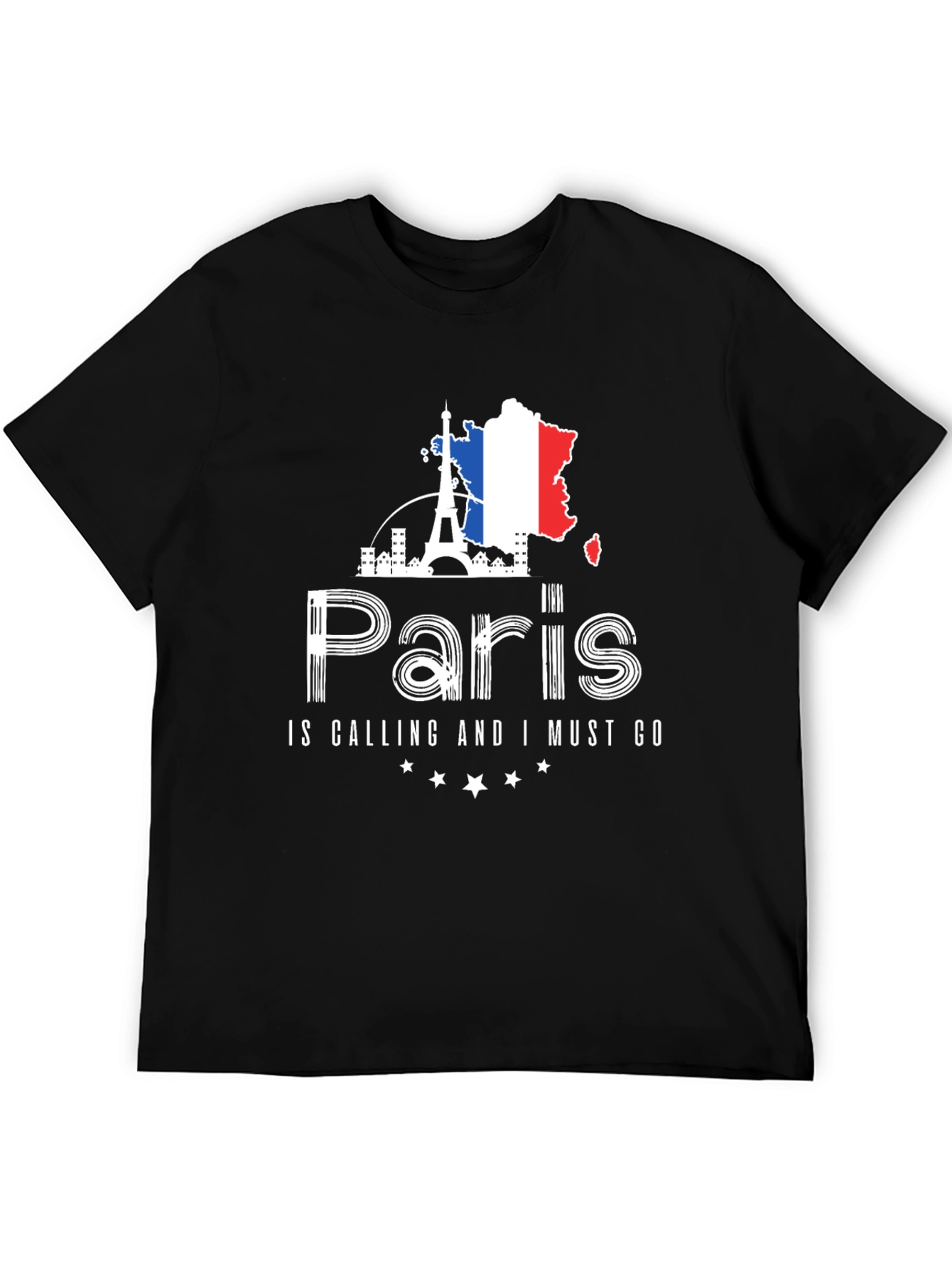 Show your love for the City of Lights with this stylish black t-shirt. Featuring a unique design with the Eiffel Tower and the outline of France colored with the French flag, this tee is perfect for travelers and Francophiles alike. The shirt reads "Paris IS CALLING AND I MUST GO" accompanied by five stars. Made from a soft and comfortable fabric, this casual tee is ideal for everyday wear, vacation, or as a souvenir. This shirt is the perfect way to celebrate your favorite city.