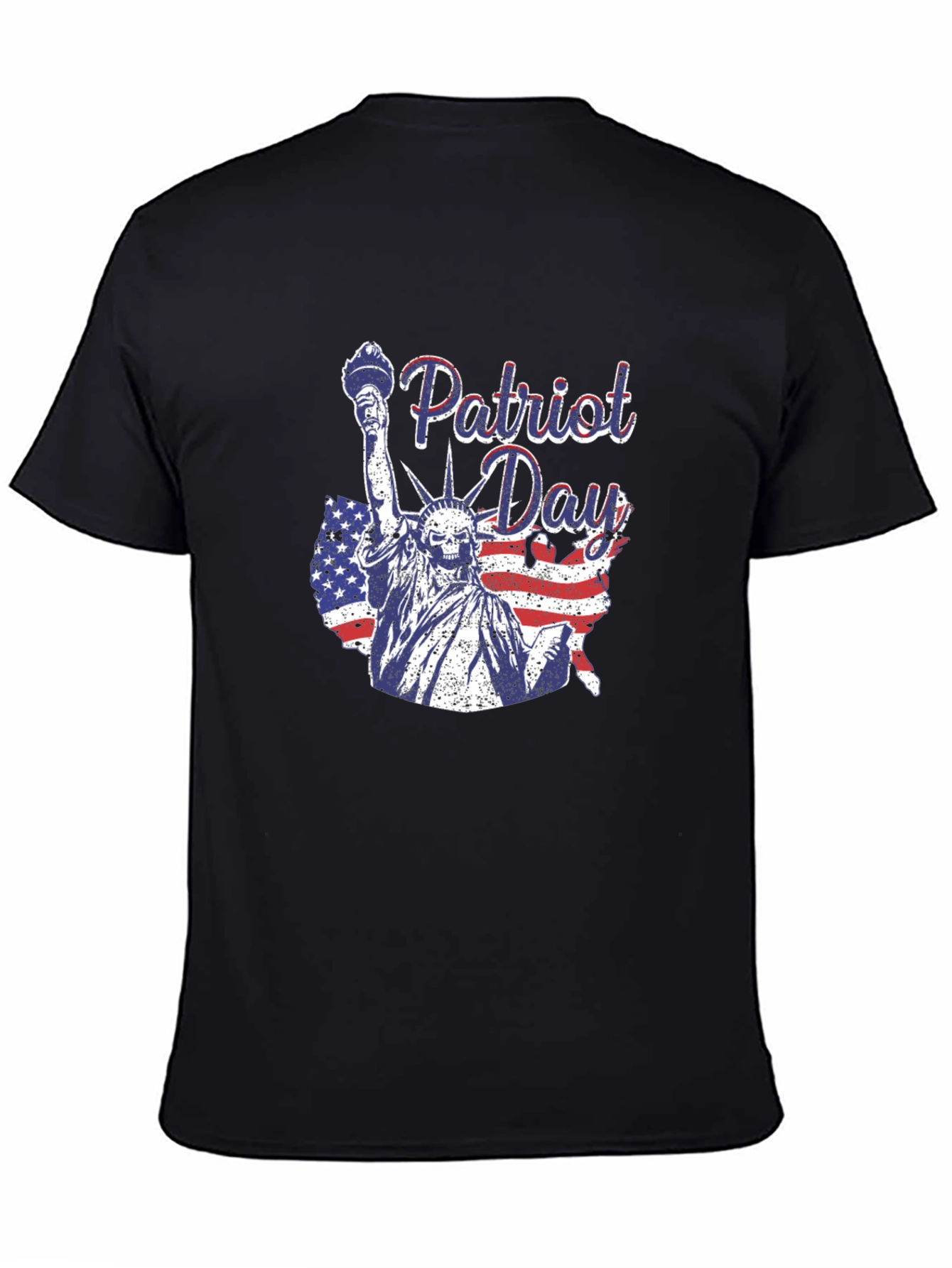 Show your patriotic spirit with this striking black t-shirt. The design features the Statue of Liberty over an American flag backdrop, boldly proclaiming 'Patriot Day' in a stylized font. This tee is perfect for celebrating national holidays, showing your love for the USA, or simply making a statement. Made from comfortable, breathable fabric, it's ideal for everyday wear. A must-have for anyone who wants to wear their patriotism proudly! Grab yours today and celebrate the land of the free with style!