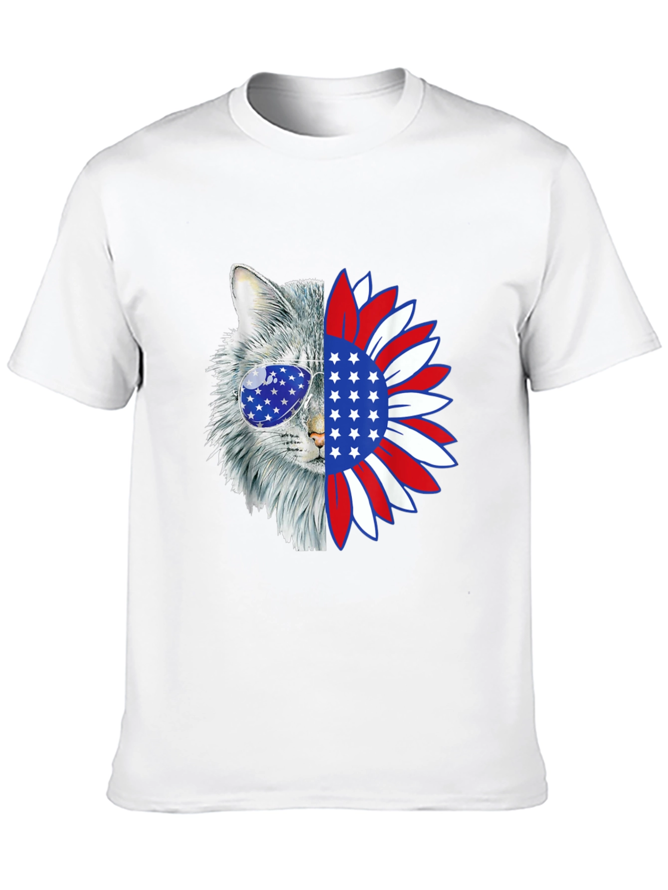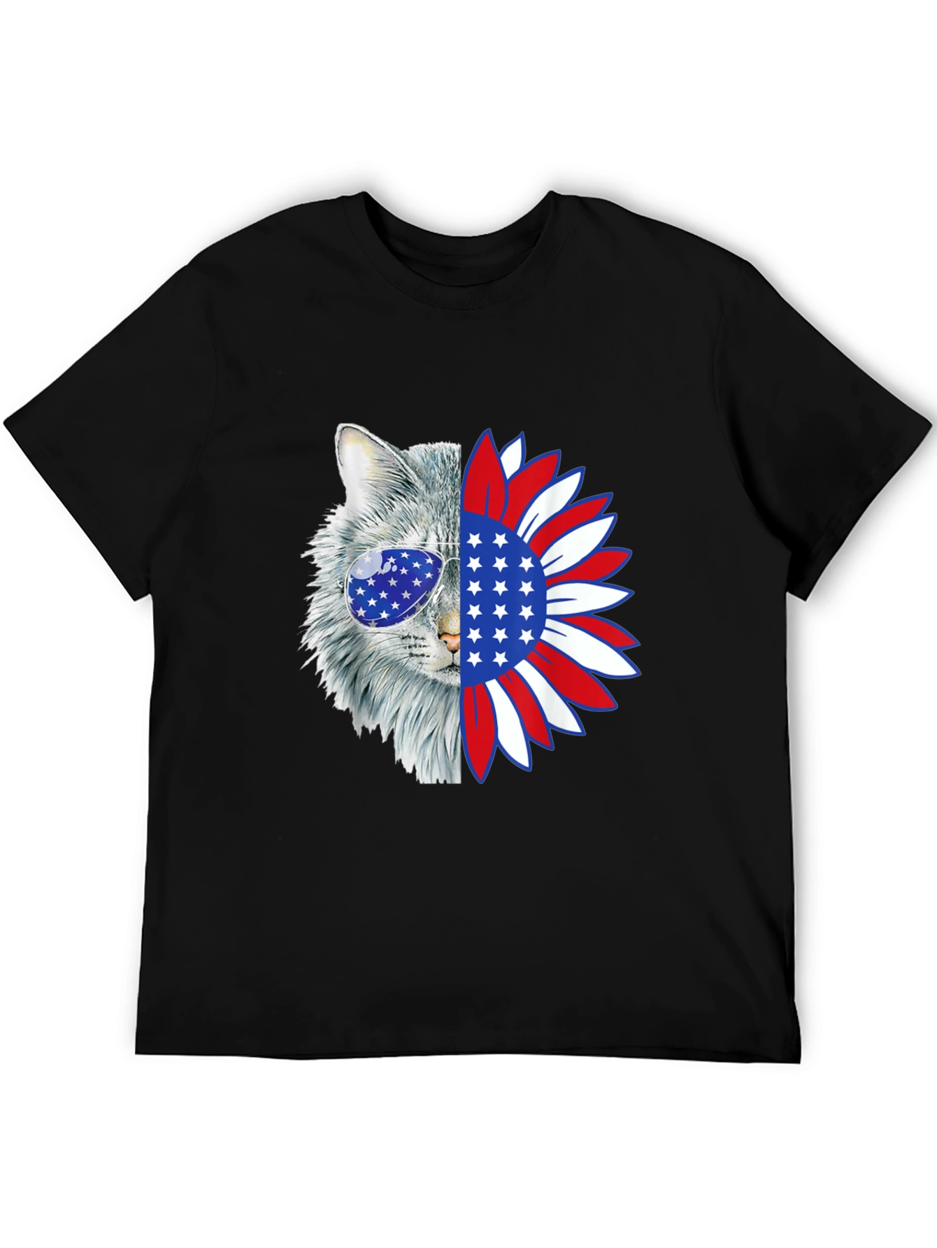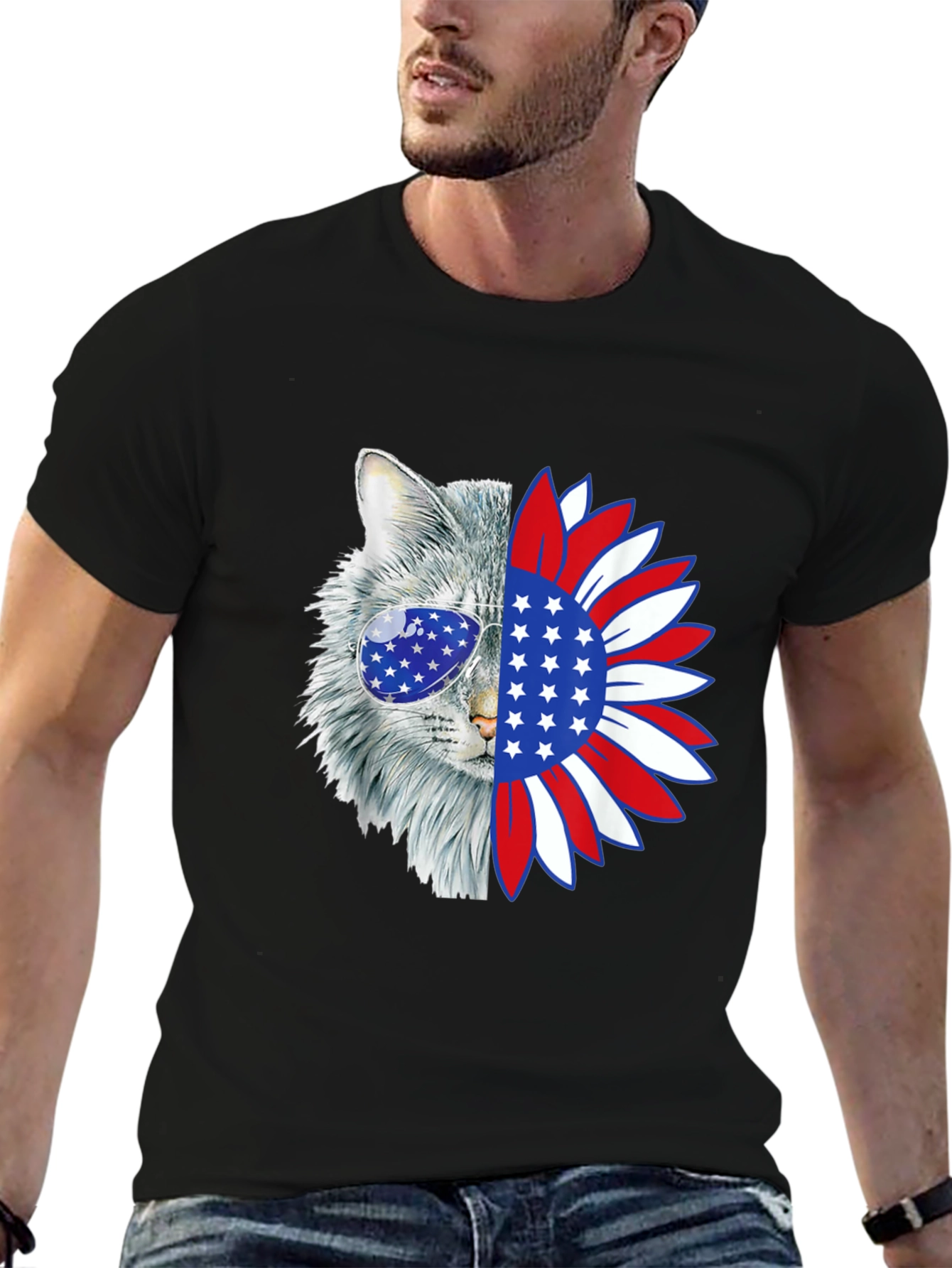 Show your love for cats and country with this unique graphic t-shirt. The design features a cute cat wearing sunglasses, combined with a patriotic sunflower design, incorporating the American flag's stars and stripes. Made from a soft, comfortable material, this tee is perfect for casual wear, 4th of July celebrations, or any day you want to express your fun and patriotic side. This eye-catching shirt is sure to turn heads and spark conversations. Add a touch of whimsy to your wardrobe with this must-have statement piece.