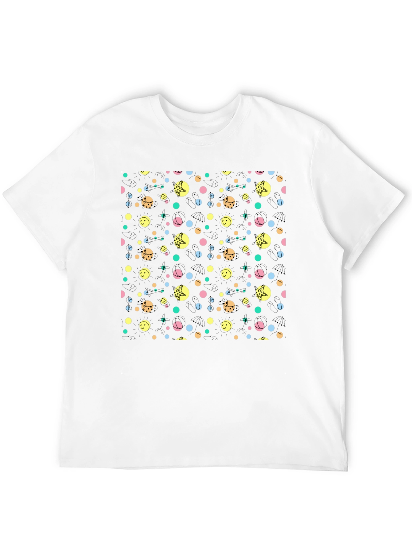 This stylish black t-shirt features a playful and colorful pattern. The design includes various shapes such as circles and cartoon-like figures, giving it a fun and eye-catching appearance. The t-shirt seems to be made of a comfortable fabric, perfect for everyday wear. Its classic fit makes it versatile for different body types. This t-shirt would be a great addition to any casual wardrobe, ideal for outings, casual hangouts, or just lounging around in style. The unique pattern ensures you'll stand out with a touch of whimsy.