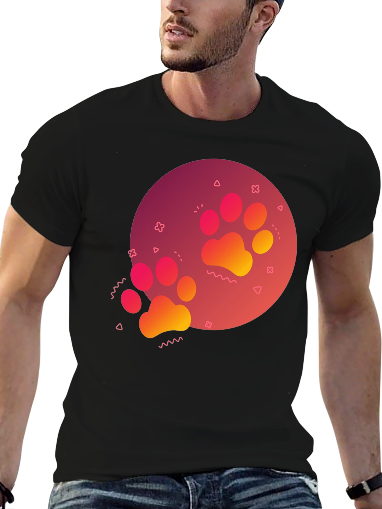 Show off your love for animals with this stylish and comfortable t-shirt. This classic black tee features a vibrant, gradient paw print design set against a circular backdrop. The eye-catching graphic is sure to turn heads. Made from a soft, breathable fabric, this t-shirt is perfect for everyday wear. Its versatile design makes it ideal for casual outings, running errands, or simply relaxing at home. The standard fit ensures a comfortable and flattering silhouette. Add a touch of fun and personality to your wardrobe with this must-have graphic tee. Easy to care for and designed for lasting wear.