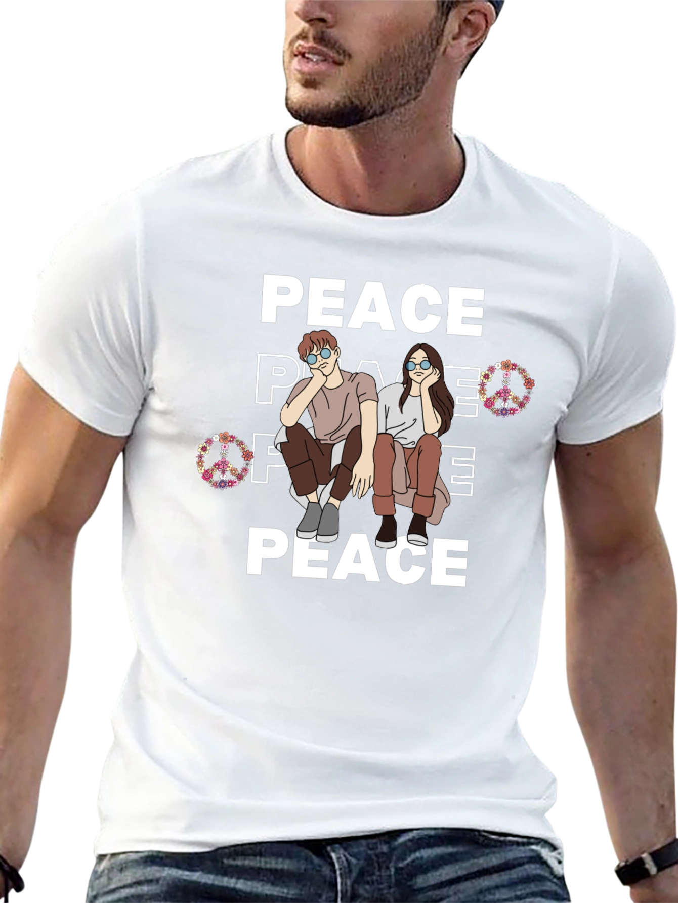 Express your groovy side with this Peace Graphic T-Shirt! This classic black tee features a retro cartoon design of a peace-loving couple. The bold “PEACE” text and floral peace signs add a touch of vintage charm. Made from soft, breathable cotton, this unisex t-shirt is comfortable enough for everyday wear. Dress it up or down - it's perfect for casual outings, music festivals, or just lounging around. Let your style spread a message of peace and love!