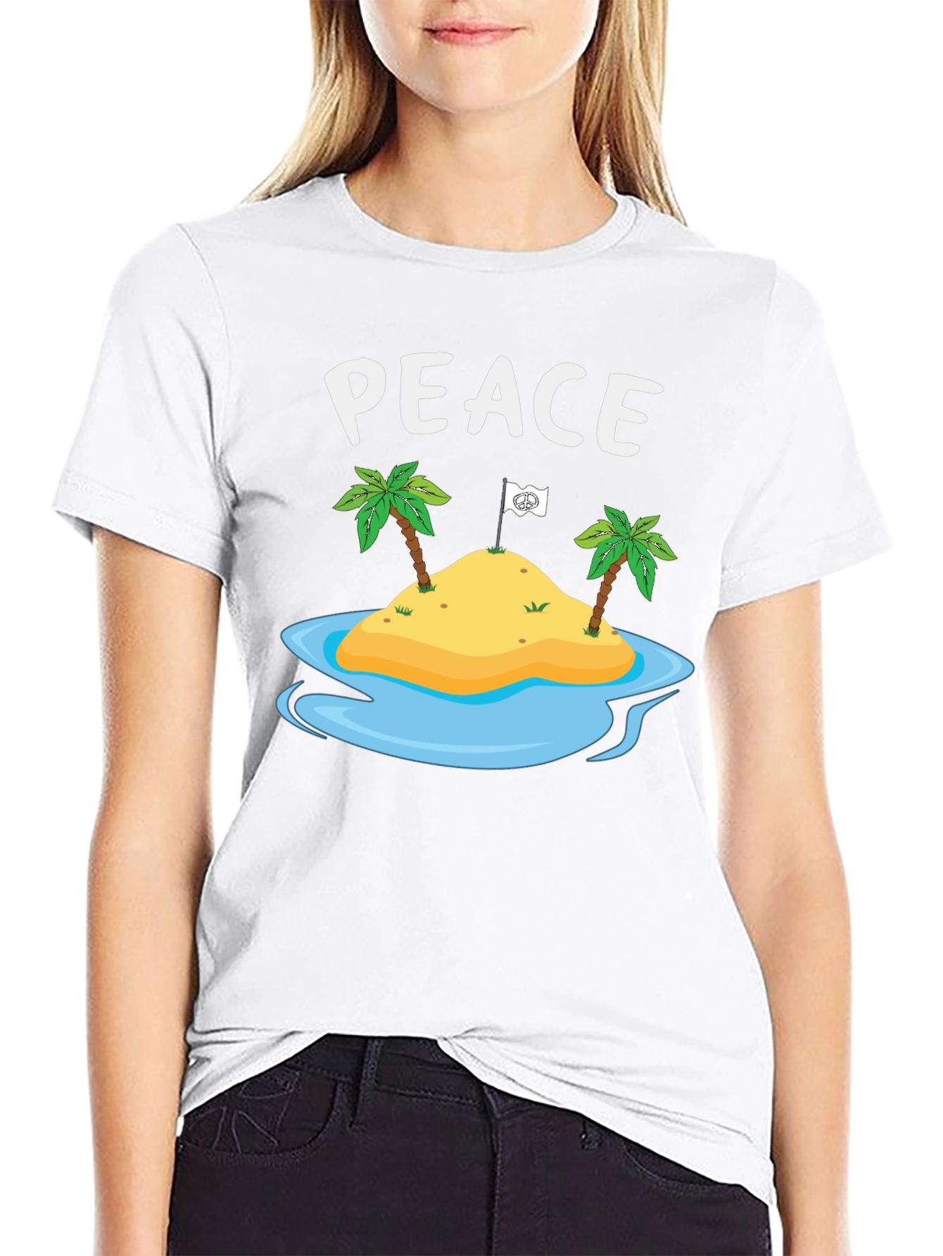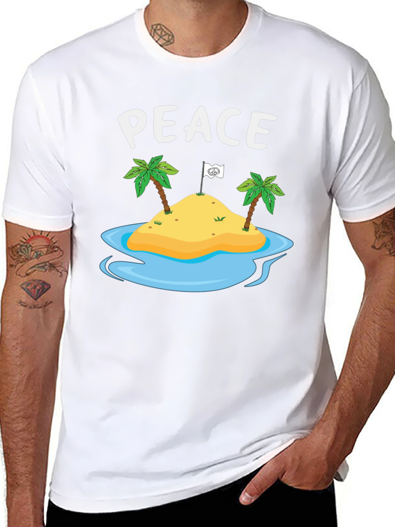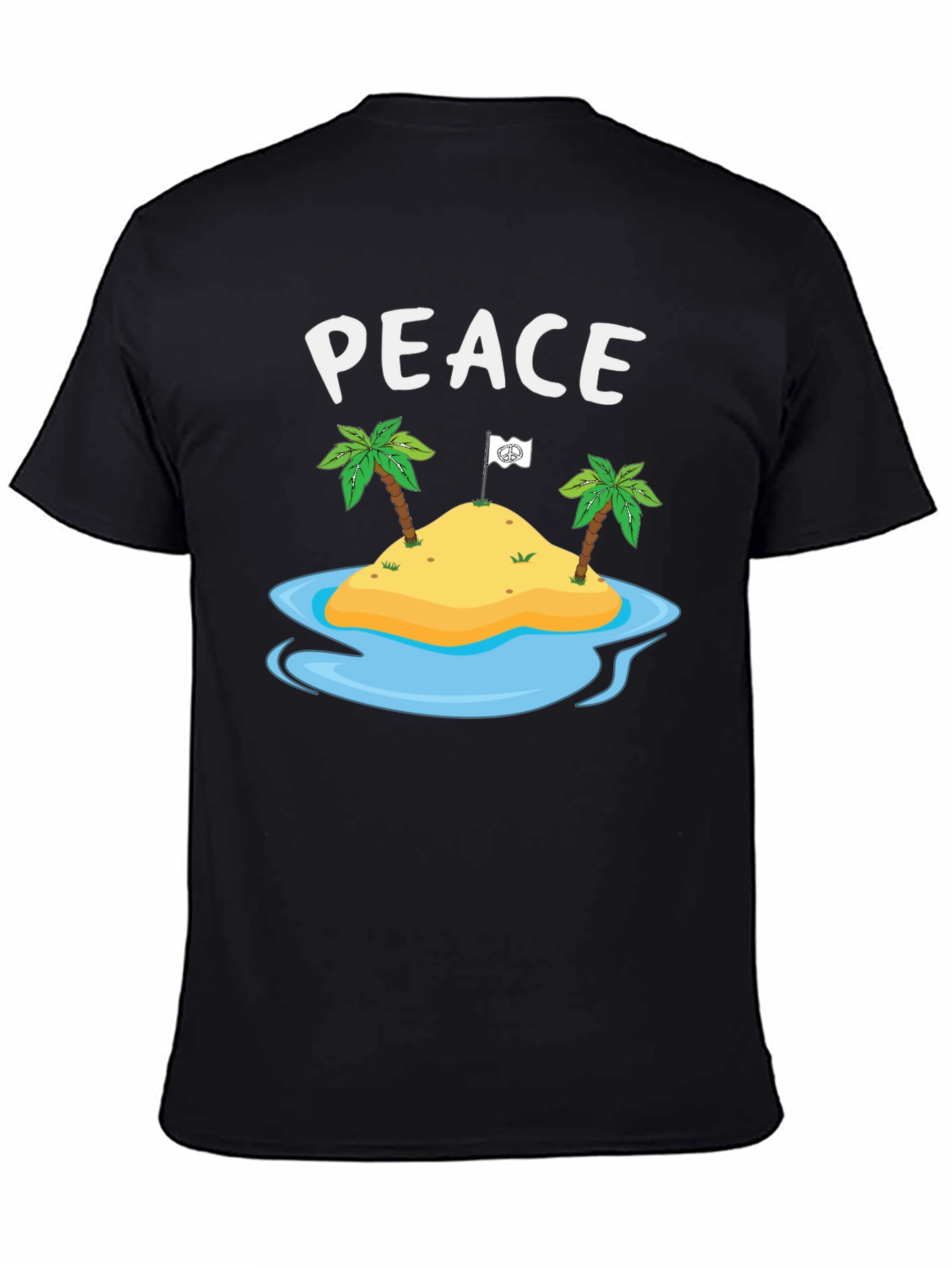 Embrace serene vibes with this unique graphic t-shirt! Featuring a vibrant island design, complete with swaying palm trees, a sandy beach, and a peaceful flag, this shirt is perfect for anyone seeking a touch of tropical tranquility. The word "PEACE" is displayed above the island, reinforcing the calming message. Made from a comfortable, black fabric, this tee is ideal for casual wear, beach outings, or simply relaxing at home. Let this eye-catching t-shirt be your reminder to embrace the peace within!