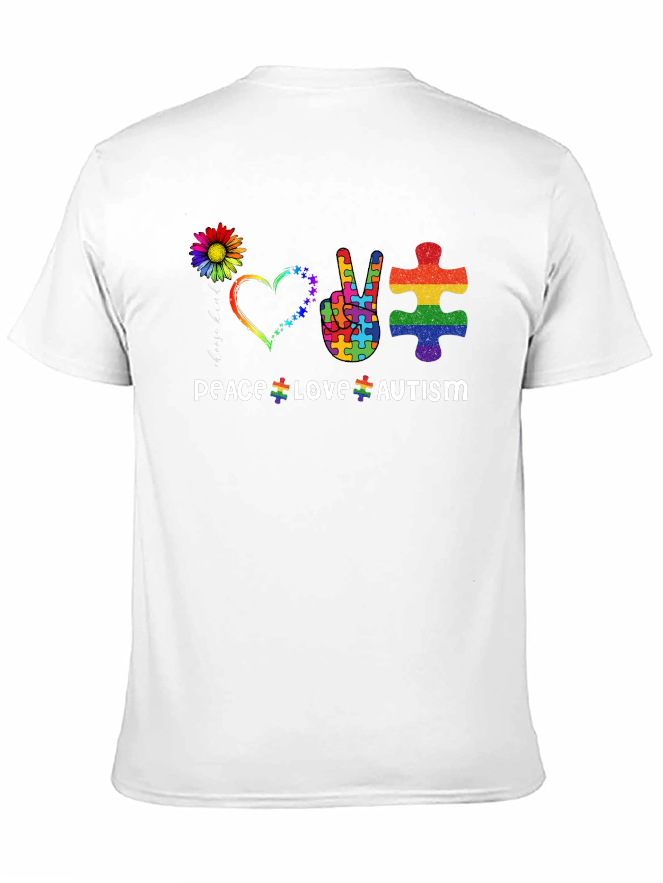 Show your support with this black, short-sleeve t-shirt featuring a vibrant "Peace Love Autism" design. The graphic incorporates a colorful daisy, a heart made of stars, a puzzle-piece peace sign, and a rainbow puzzle piece, symbolizing unity and understanding. Made from a soft, comfortable fabric, this tee is perfect for raising awareness at events, casual wear, or as a thoughtful gift. Spread a positive message and promote acceptance with this eye-catching and meaningful t-shirt. A stylish and comfortable way to advocate for autism awareness.