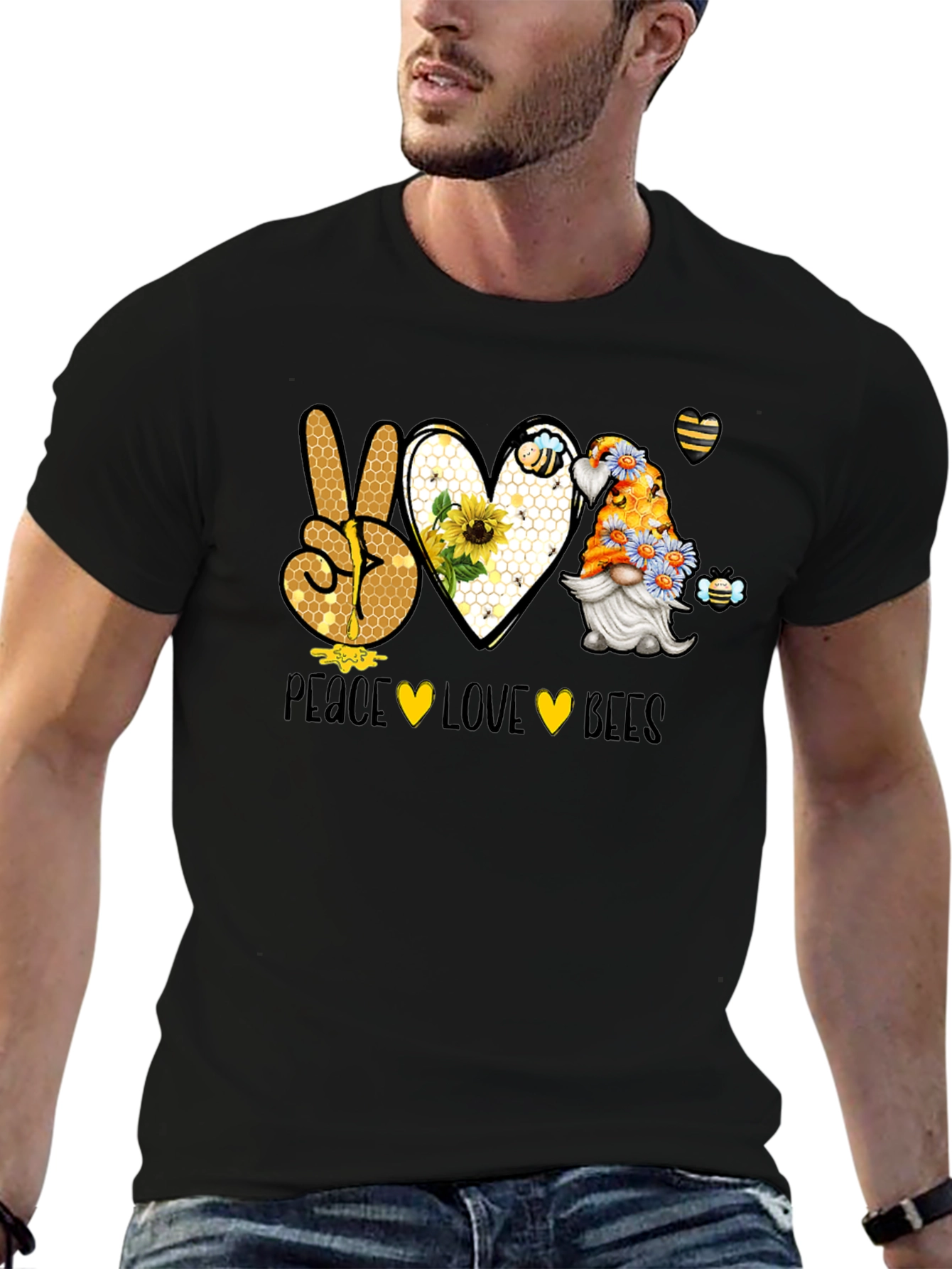Show your love for bees with this adorable black t-shirt! Featuring a playful "Peace Love Bees" design with a peace sign, a heart with a sunflower, and a cute gnome wearing a bee-themed hat, this tee is perfect for bee enthusiasts. The charming graphic is printed on a comfortable and stylish black shirt, making it ideal for everyday wear or a casual outing. The fun design and soft fabric make it a great addition to any wardrobe. Perfect for nature lovers, gardeners, or anyone who appreciates the beauty of bees and gnomes. Get yours today and spread the buzz!