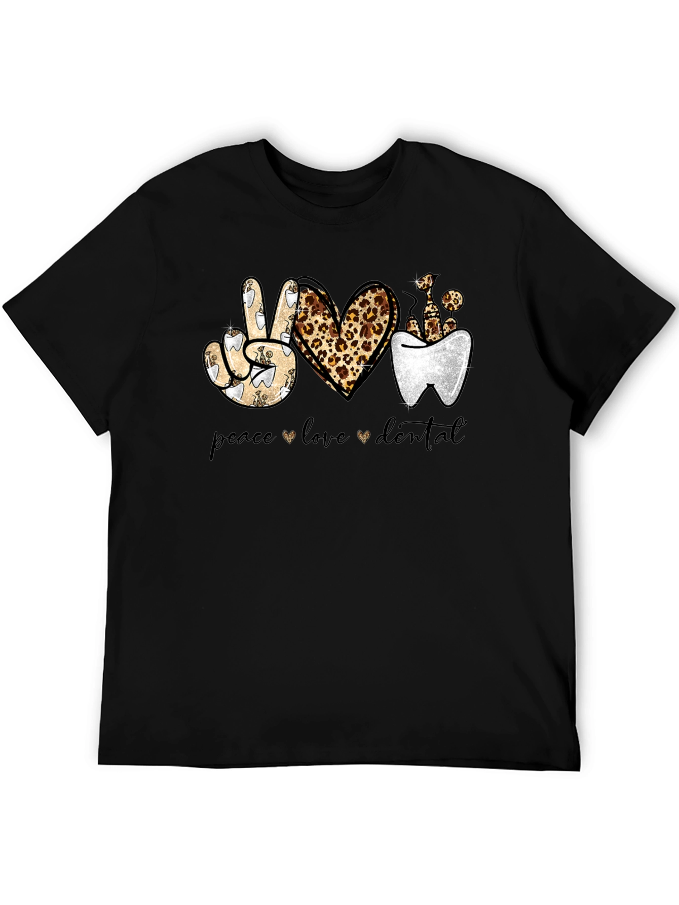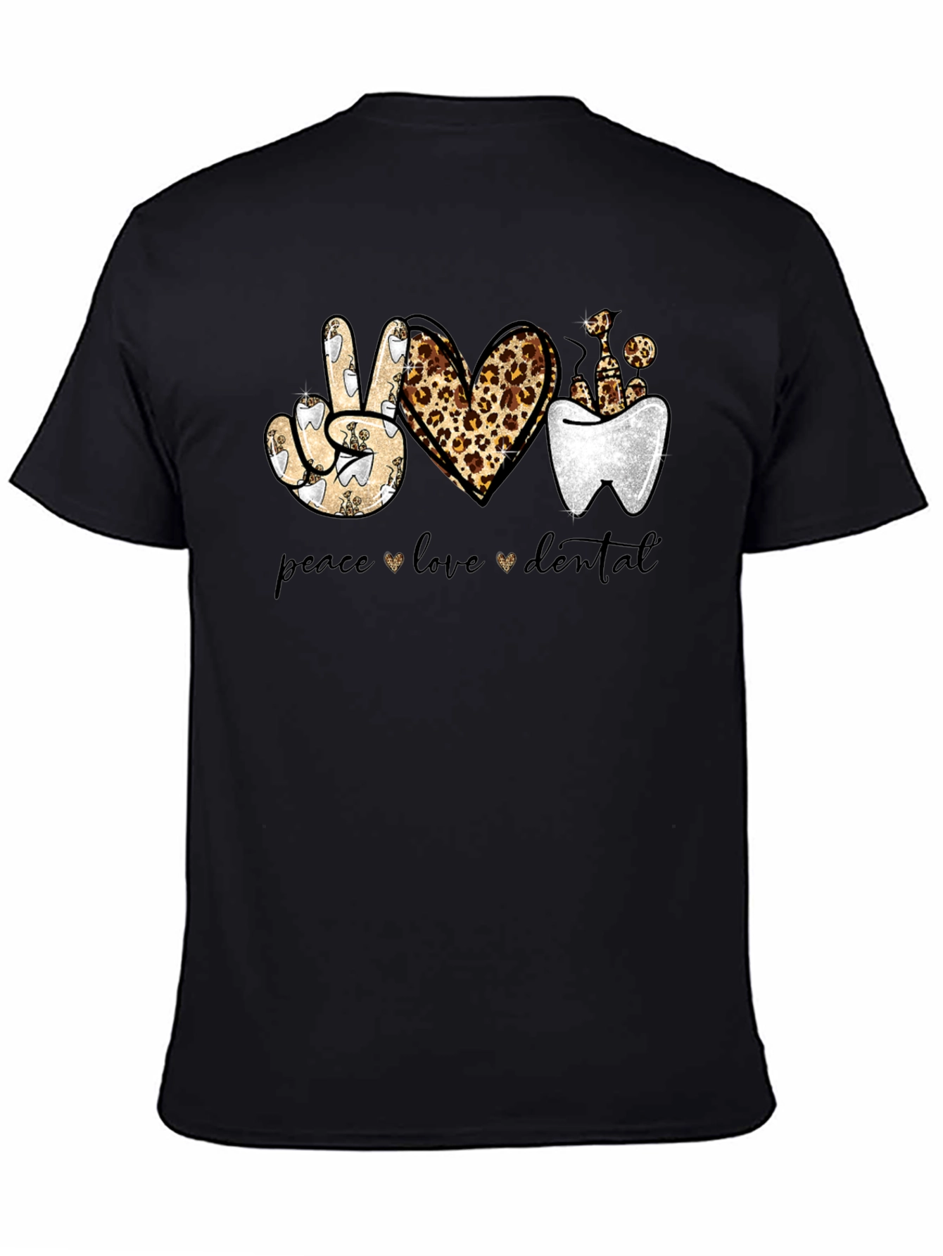 Show your love for dentistry with this unique t-shirt! This black tee features a fun design incorporating a peace sign, heart, and tooth, all decorated with a stylish pattern. "Peace Love Dental" is written in a cursive font. Made from comfortable materials, it's perfect for dentists, dental hygienists, or anyone in the dental field. Wear it to work, casual events, or simply to showcase your passion for a healthy smile. A great gift for the dental professional in your life!