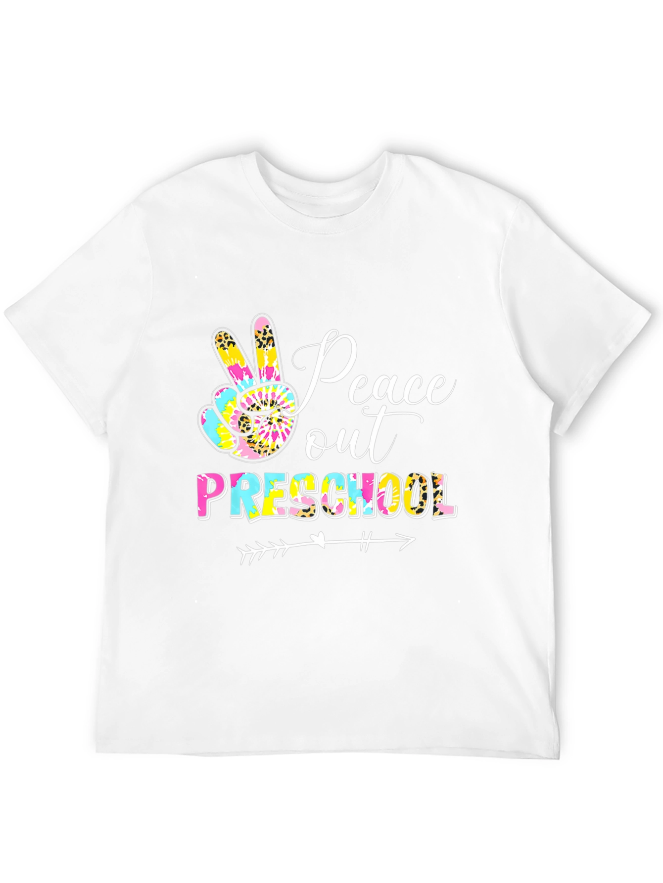 Show off your fun side with this 'Peace Out Preschool' graphic tee! The black shirt features a colorful peace sign with a tie-dye pattern and leopard print, alongside the playful phrase 'Peace out Preschool' in a whimsical font. An arrow graphic adds a touch of bohemian flair. Perfect for teachers or anyone celebrating the end of the school year, this comfortable tee is sure to turn heads. Ideal for casual outings, school events, or lounging at home. This unique design lets you celebrate in style.