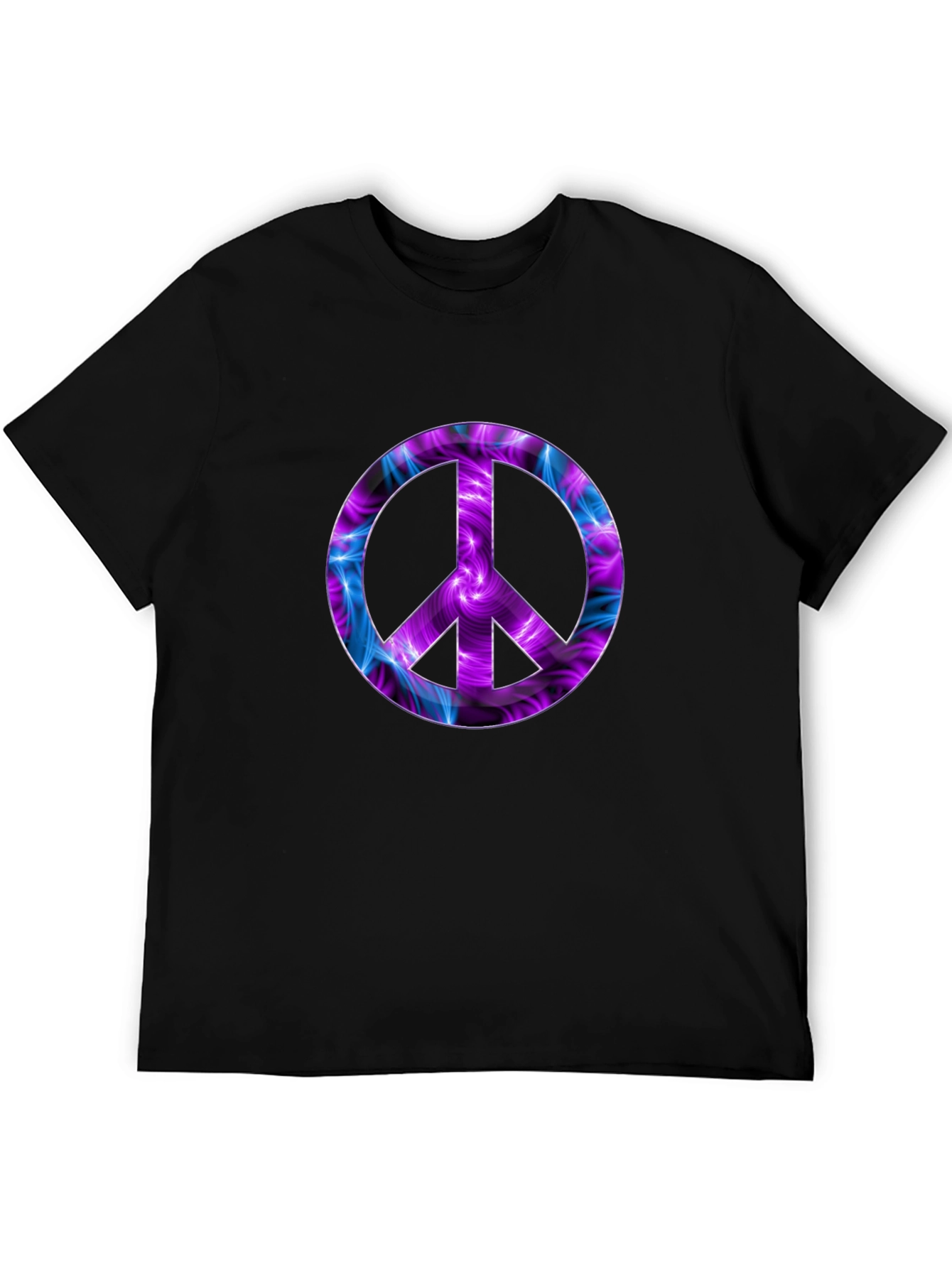 Show your love for peace with this stylish black graphic tee. The shirt features a vibrant peace sign design, filled with swirling purple and blue hues that create a mesmerizing visual effect. Made from a soft, comfortable fabric, this tee is perfect for everyday wear. The classic crew neck and short sleeves make it a versatile addition to any wardrobe. Whether you're heading to a festival, hanging out with friends, or simply relaxing at home, this peace sign tee is a great way to express your values and stand out from the crowd. Get yours today and spread the message of peace and love!
