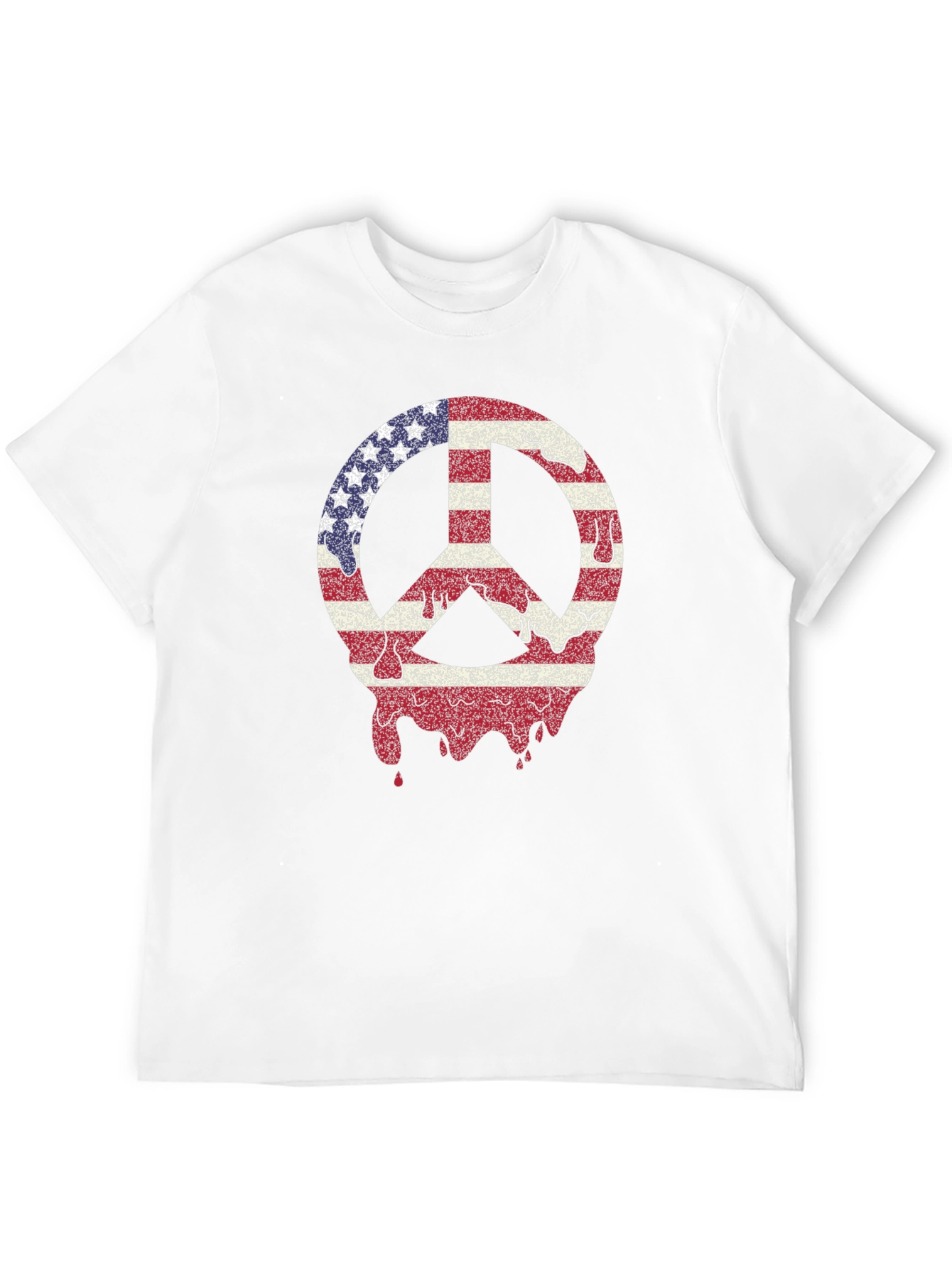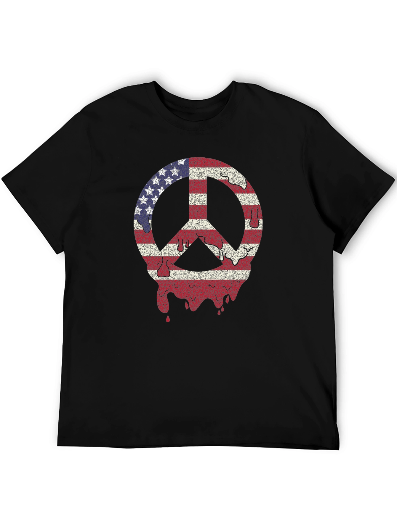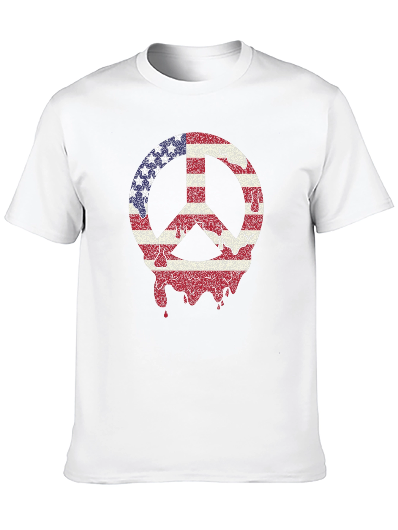 Show your patriotic side with this unique graphic t-shirt. Featuring a distressed peace sign design with the American flag pattern, this tee offers a bold statement. The 'dripping' effect adds a touch of edgy style. Made from comfortable fabric, it's perfect for casual wear, patriotic events, or expressing your love for freedom. Pair it with jeans or shorts for a relaxed look. A must-have for anyone who wants to spread peace with a touch of American pride!