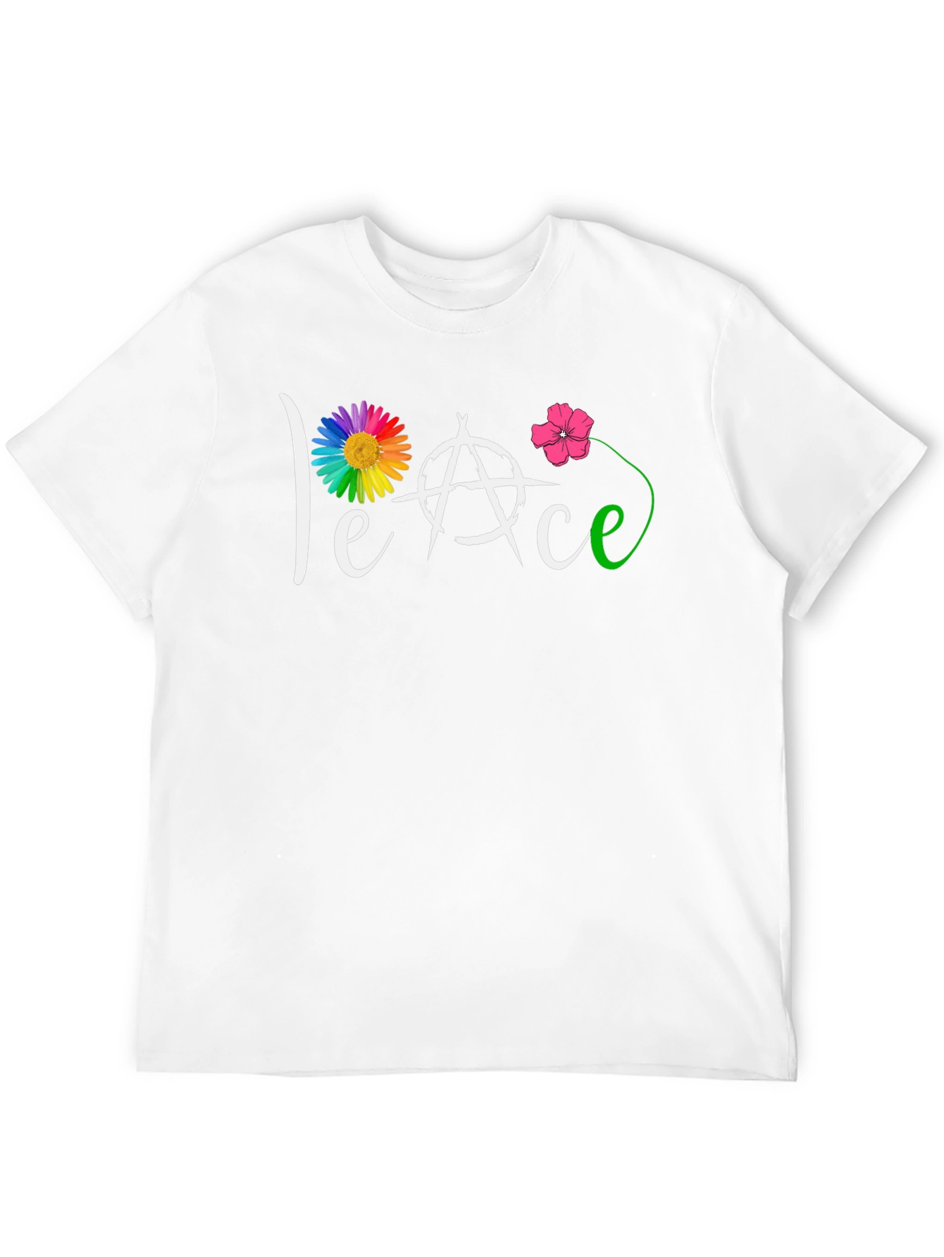 Show your commitment to peace with this unique graphic t-shirt. The design features a stylized "peace" inscription, where each letter is creatively replaced with symbols of harmony and freedom. A rainbow-colored daisy, anarchy sign, and a pink flower with a green stem form the word in a visually striking way. Made from a comfortable, breathable fabric, this t-shirt is perfect for casual wear, social gatherings, or expressing your values. Let your outfit speak volumes with this bold statement piece.