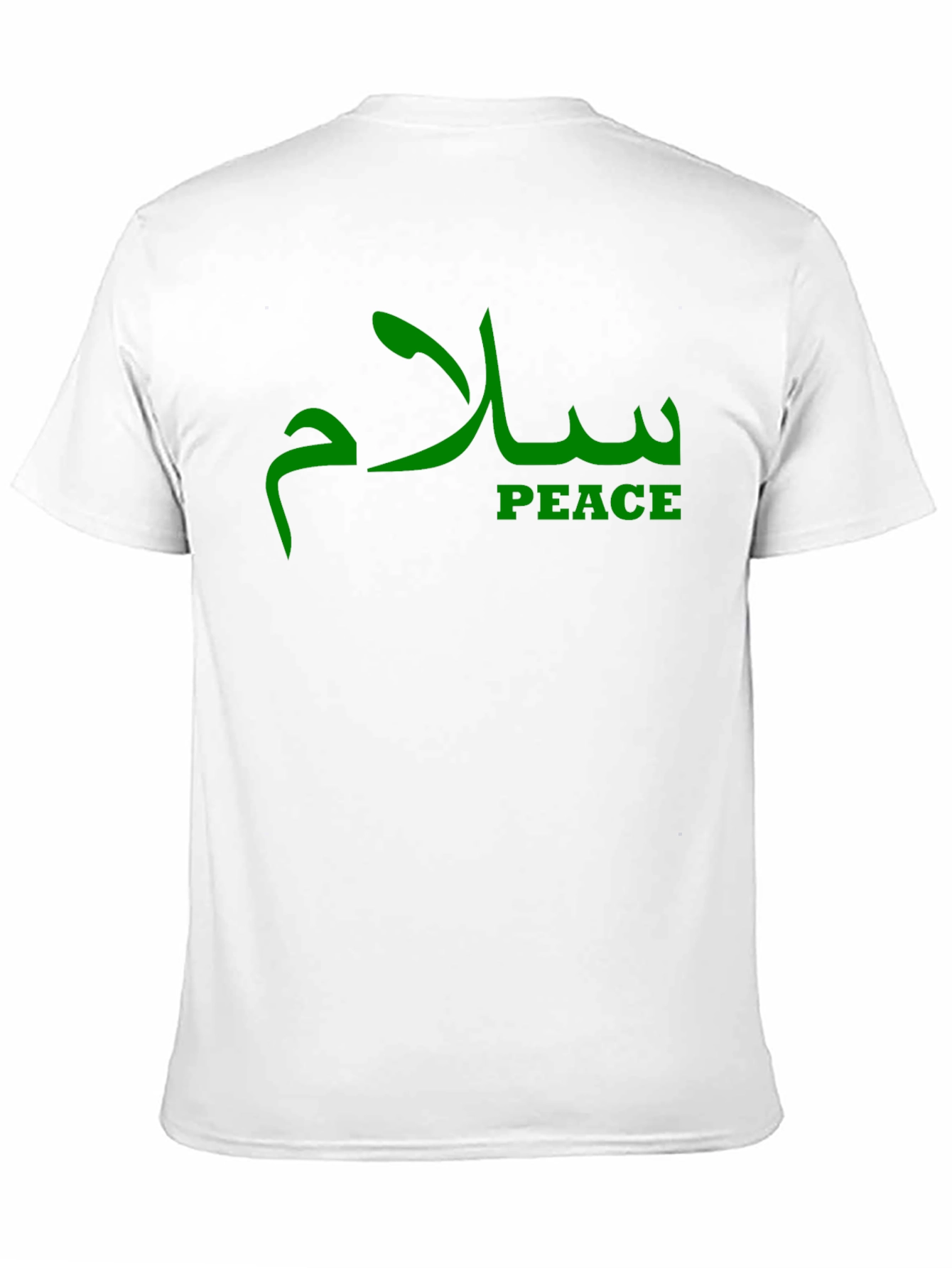 Show your support for peace with this stylish black t-shirt. The shirt features a striking green design with the word 'Peace' written in both English and elegant Arabic calligraphy. Made from a comfortable material, this shirt is perfect for everyday wear, casual outings, or making a statement at events. The bold design and meaningful message are sure to spark conversations and spread a positive message wherever you go. This unique tee is a great addition to any wardrobe and also makes a thoughtful gift for those who value peace and cultural appreciation. Get yours today and wear your heart on your sleeve!