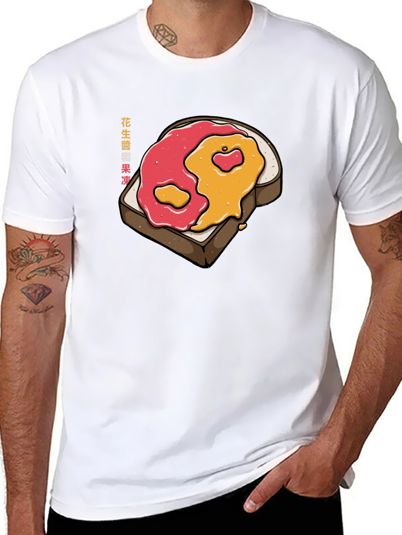 This black t-shirt features a whimsical and eye-catching graphic of a peanut butter and jelly sandwich on the chest. The design showcases the classic treat with vibrant red and yellow colors in a yin-yang style on a slice of toast. Chinese characters are printed beside the graphic. Made from what appears to be comfortable, breathable cotton, this t-shirt is perfect for casual wear. The design adds a playful and fun touch to any outfit, making it ideal for those who appreciate unique and quirky apparel. This t-shirt is sure to be a conversation starter and a great addition to any wardrobe. Perfect for weekend outings, casual Fridays, or relaxing at home.