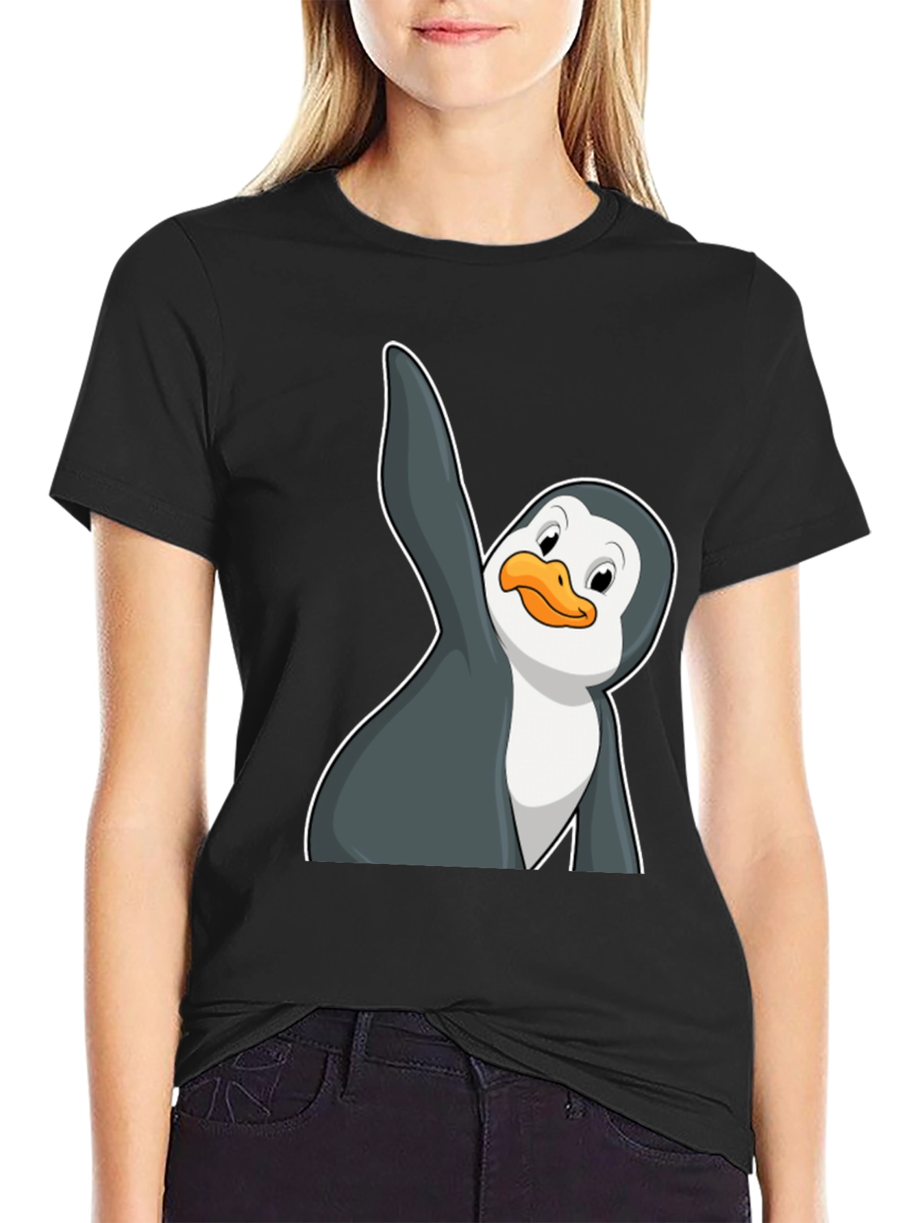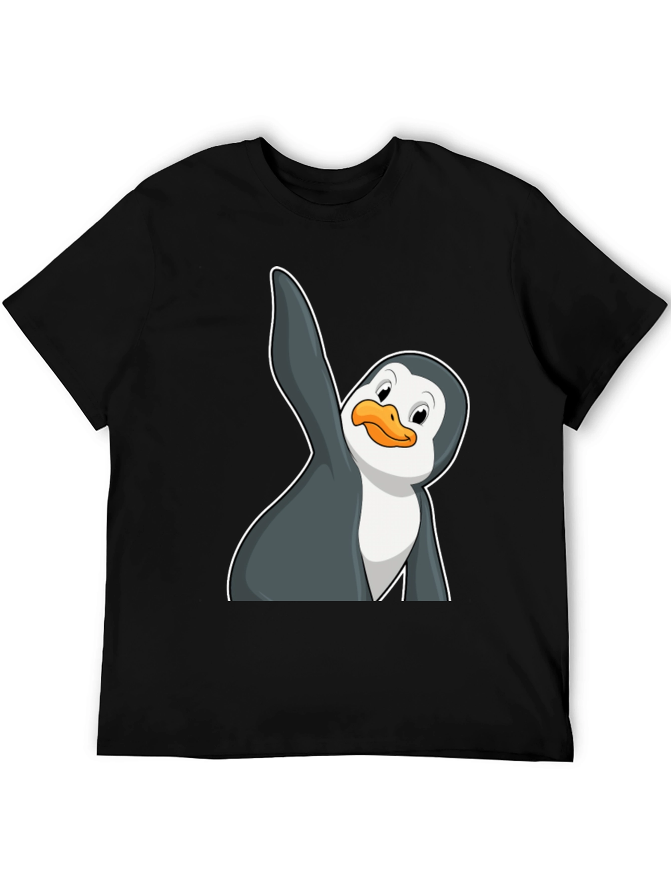 Show off your playful side with this fun men's t-shirt! This black tee features a cartoon penguin graphic, adding a touch of whimsy to your everyday style. The penguin appears to be waving or dancing, making it a great conversation starter. Made from a comfortable material, this shirt is perfect for casual wear, outings with friends, or adding a unique touch to your wardrobe. Pair it with jeans or shorts for a relaxed look. Ideal for penguin lovers or anyone who enjoys a fun graphic tee, this shirt is sure to become a favorite!