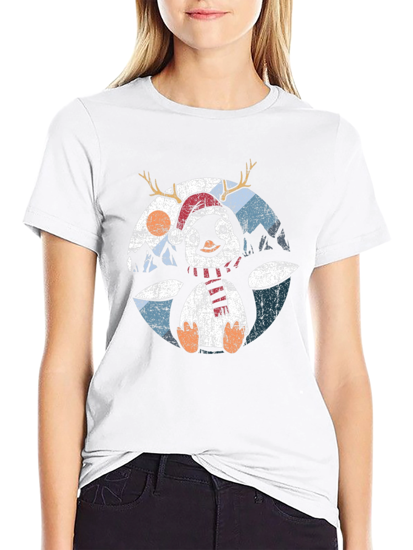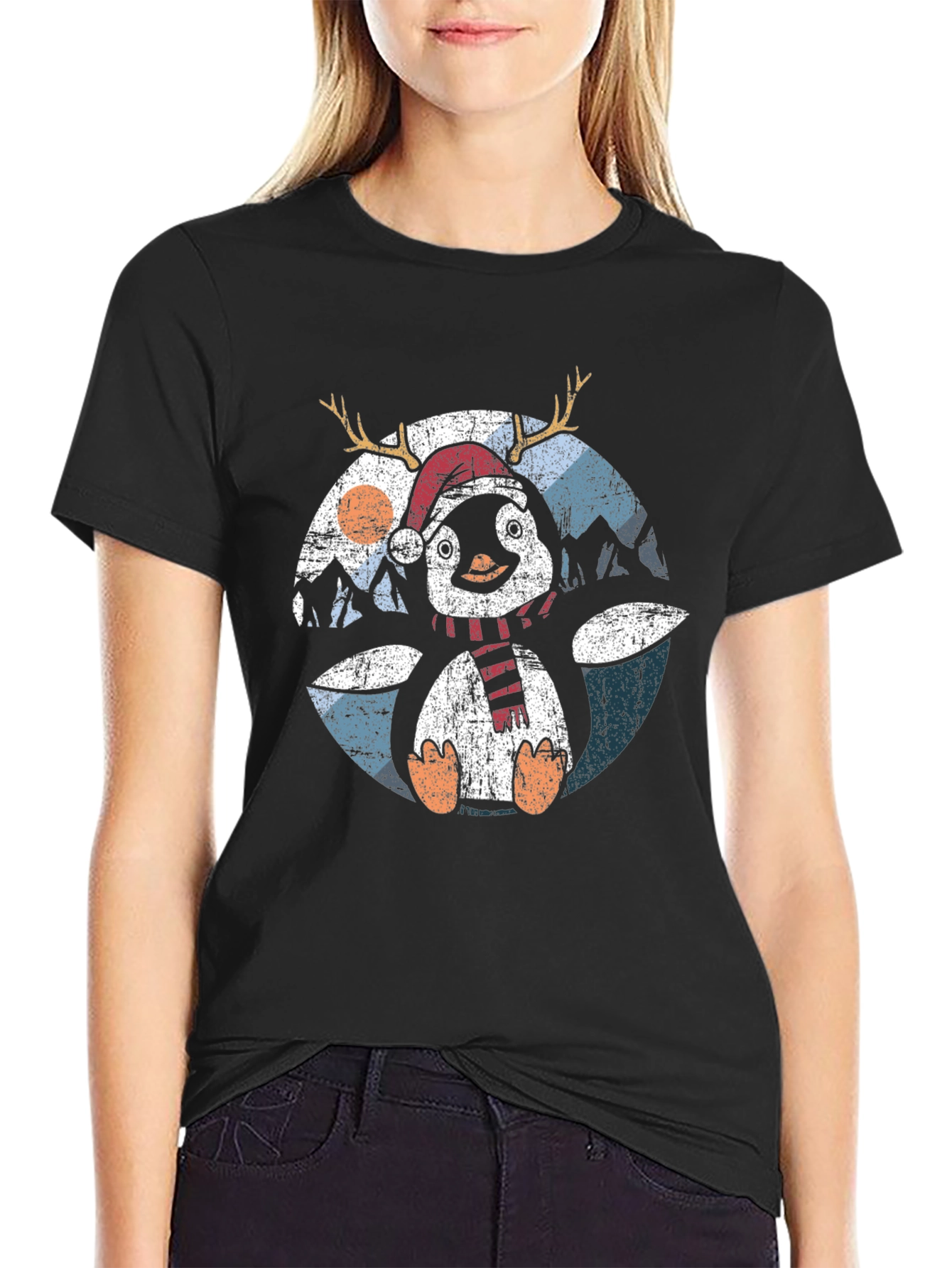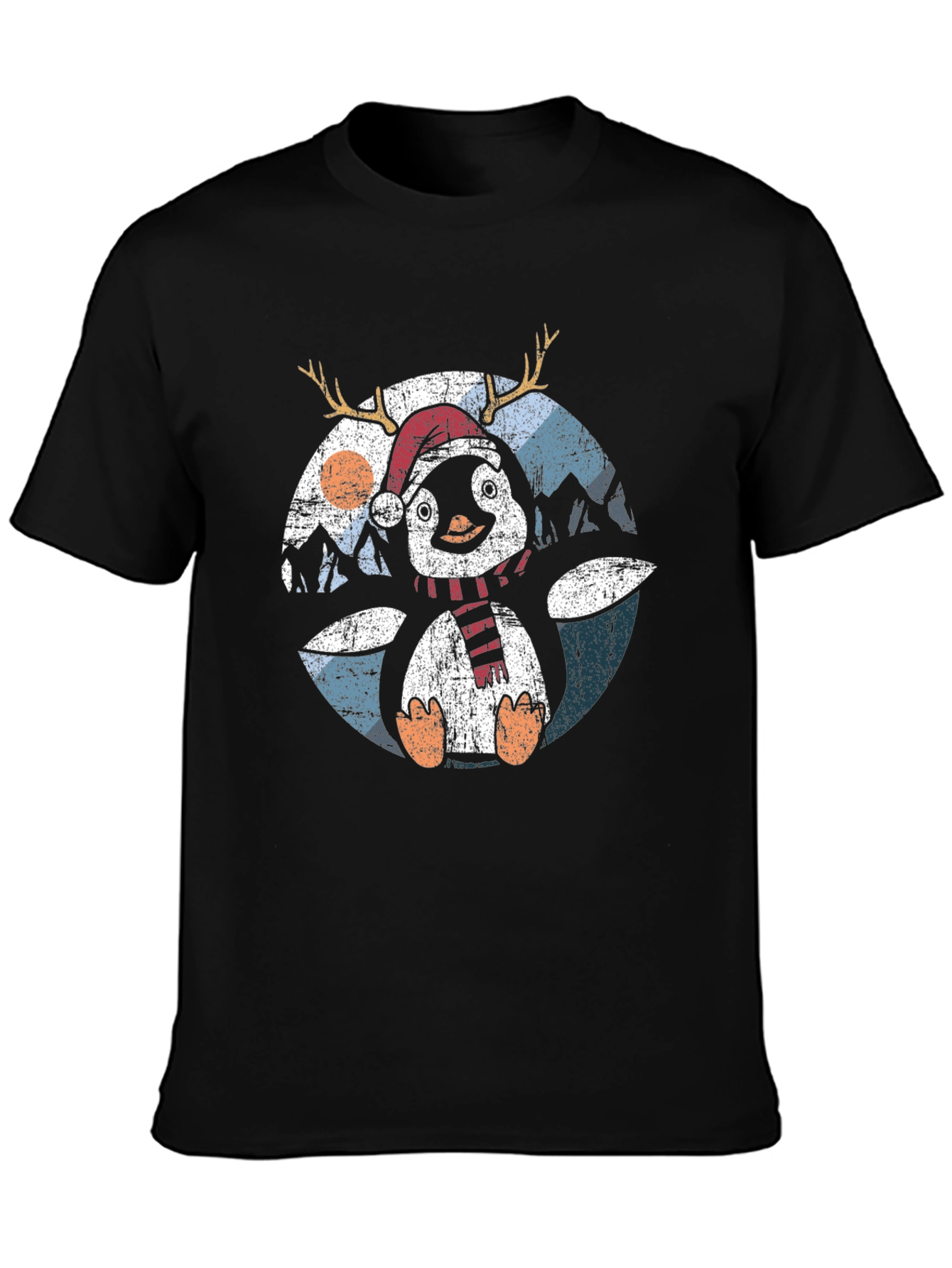 Get into the holiday spirit with this adorable penguin t-shirt! Featuring a festive penguin wearing a Santa hat and reindeer antlers, this shirt is perfect for Christmas parties or cozy nights in. The design includes a charming winter landscape backdrop. Made from comfortable, breathable cotton, this tee is ideal for casual wear during the holiday season. It's a fun and stylish way to spread some Christmas cheer, and makes a great gift for penguin lovers!