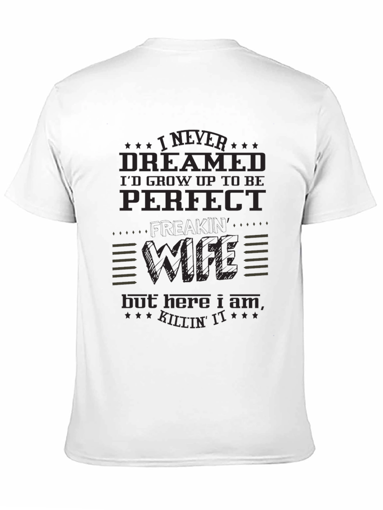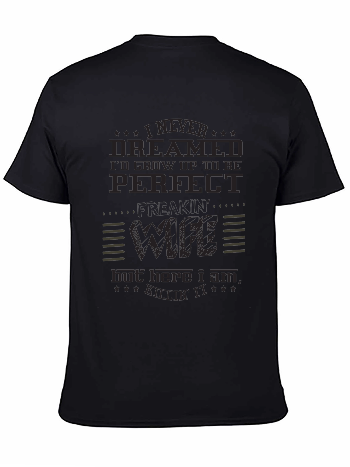 Show off your humor with this black graphic tee. Featuring a playful slogan, "I Never Dreamed I'd Grow Up to be Perfect Wife but here I am, Killin' It", this tee is perfect for casual wear. The classic fit and comfortable fabric make it ideal for everyday use. Wear it to parties, outings, or just lounging at home. This tee is sure to spark conversations and bring smiles. Great gift for the fun-loving wife!
