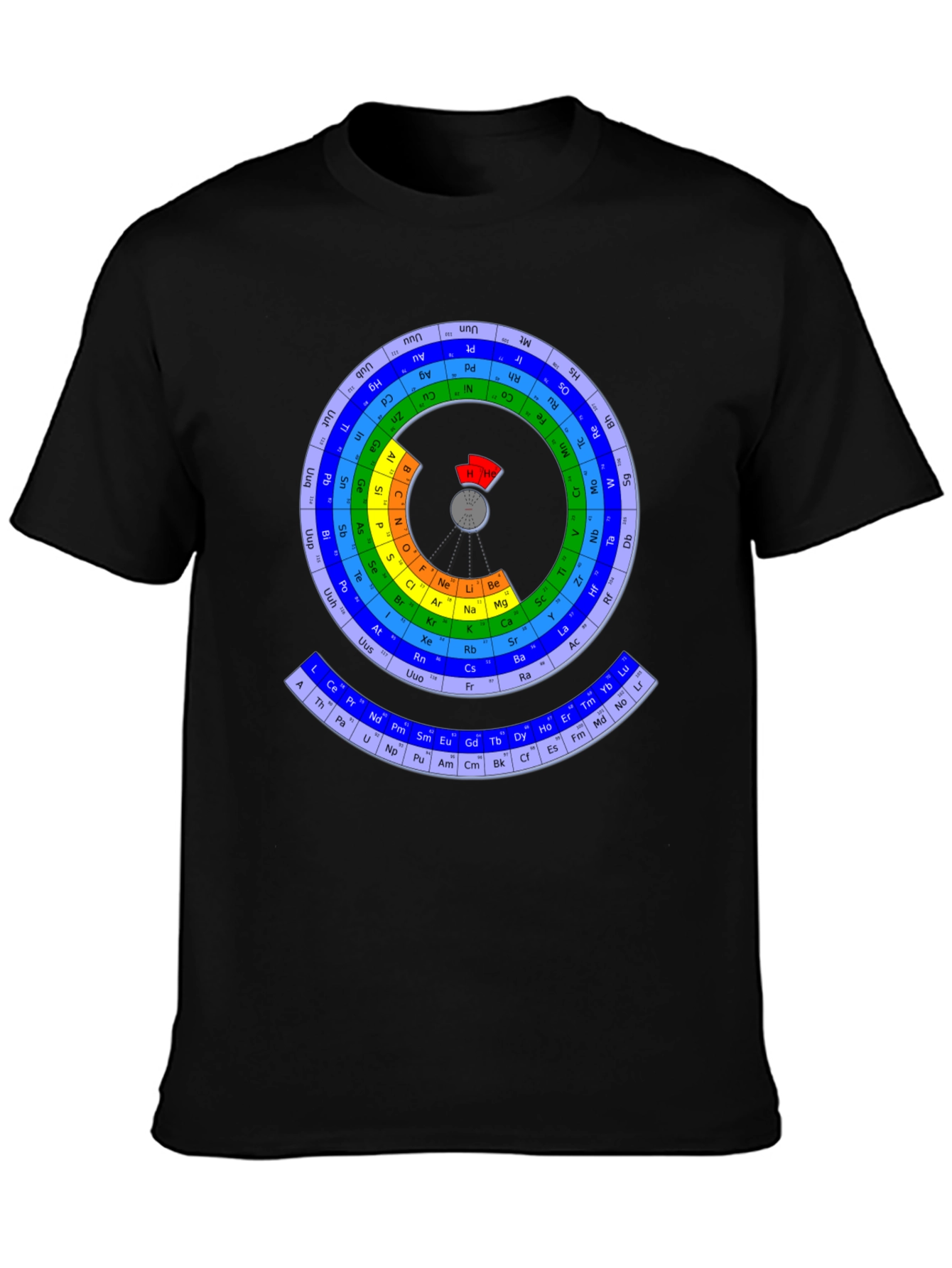 Show off your love for science with this unique t-shirt! The shirt features a colorful, circular rendition of the periodic table of elements. The design includes all the element symbols and atomic numbers arranged in a distinctive circular format. Made from soft, breathable fabric, this tee ensures all-day comfort. It's perfect for science enthusiasts, students, teachers, or anyone with a passion for chemistry. Wear it to school, science fairs, or casual outings to spark conversations and showcase your intellectual style. A great gift for the science lover in your life!