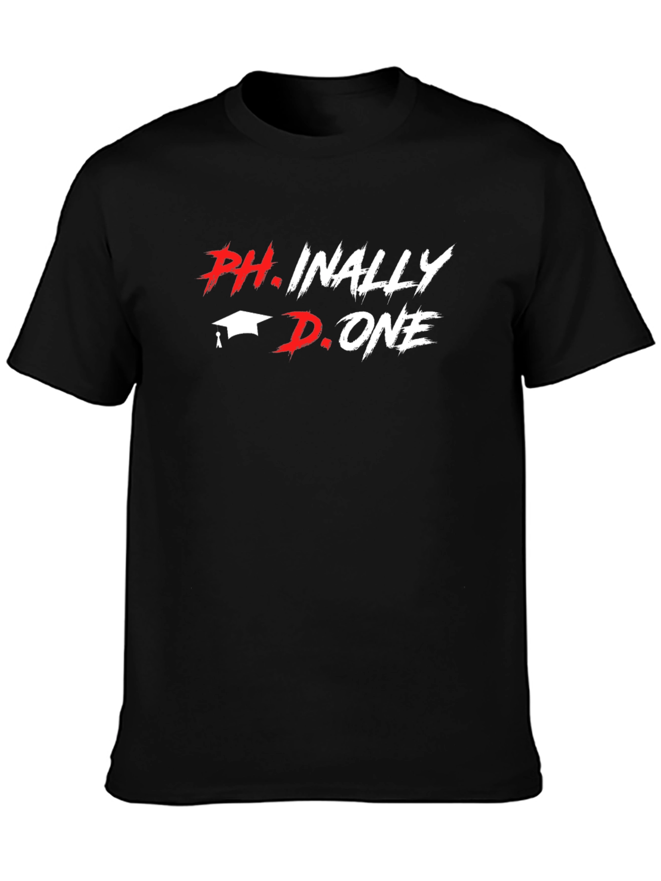 Celebrate graduation with this stylish black t-shirt! Featuring a unique design with the playful phrase "Ph.inally Done," this shirt is perfect for recent graduates. The eye-catching combination of red and white text adds a touch of flair. The shirt is made from a comfortable material, ensuring a great fit and feel. Wear it to graduation parties, alumni events, or just as a fun reminder of your academic achievements. Show off your hard-earned success with this must-have graduation tee!