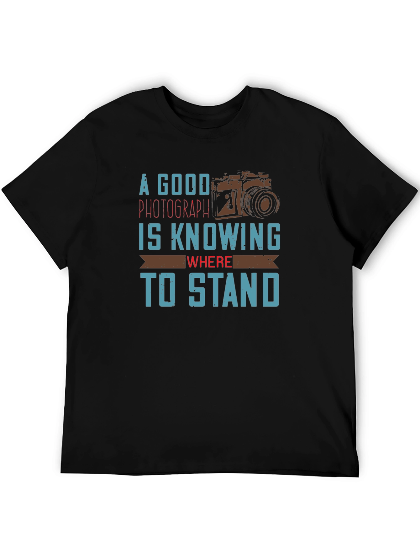Capture the perfect shot in style with this eye-catching graphic tee! Featuring a clever photography-themed quote that reads, "A good photograph is knowing where to stand," this black t-shirt is sure to resonate with photographers and creative individuals alike. The design incorporates a vintage camera illustration for an extra touch of artistry. Crafted from comfortable, breathable fabric, it's perfect for everyday wear, photography expeditions, or casual outings. Show off your passion for photography with this unique and expressive tee. A great gift for the photography enthusiast in your life! Get yours today and always be ready to stand in the right place for the perfect shot.