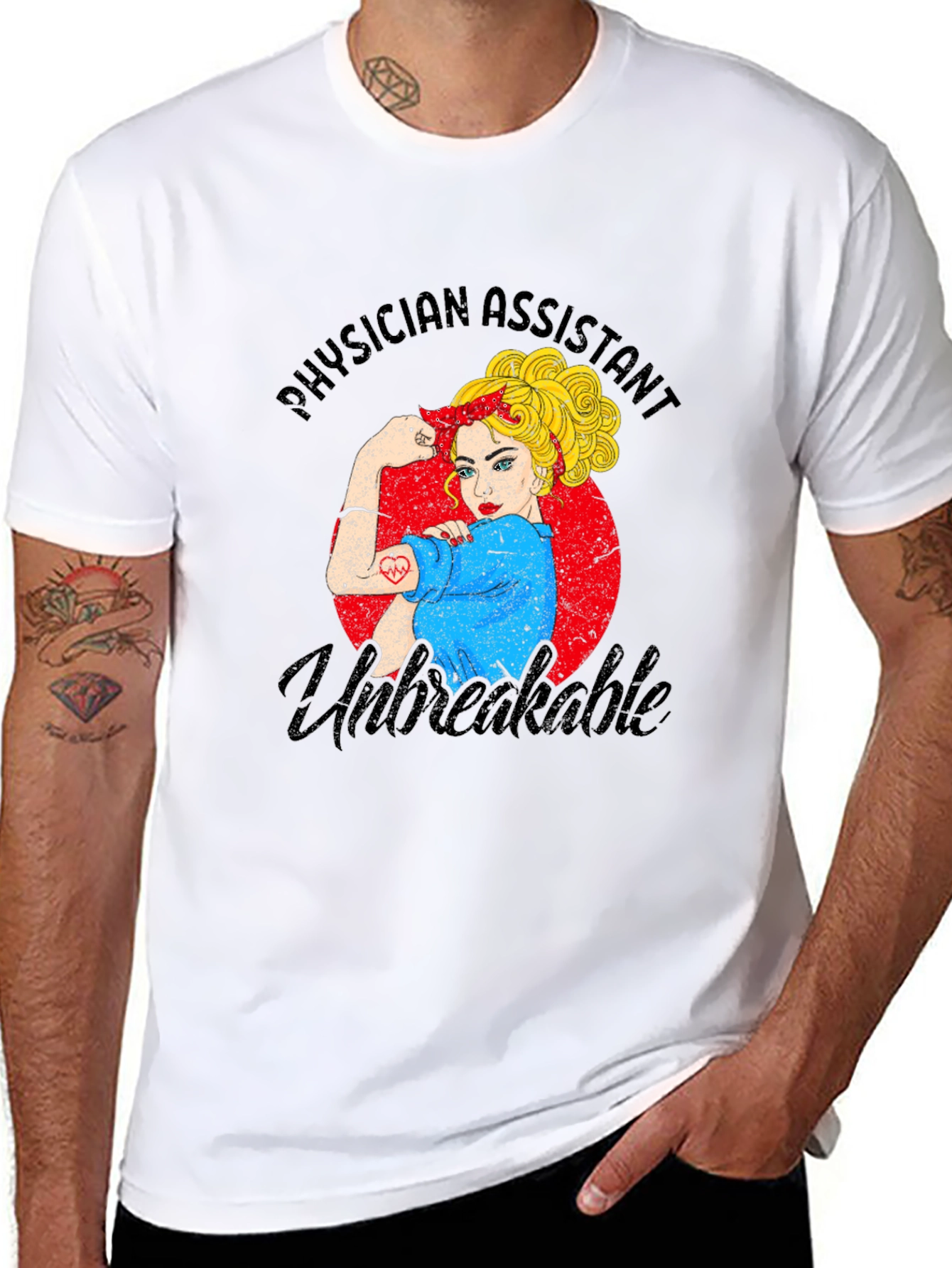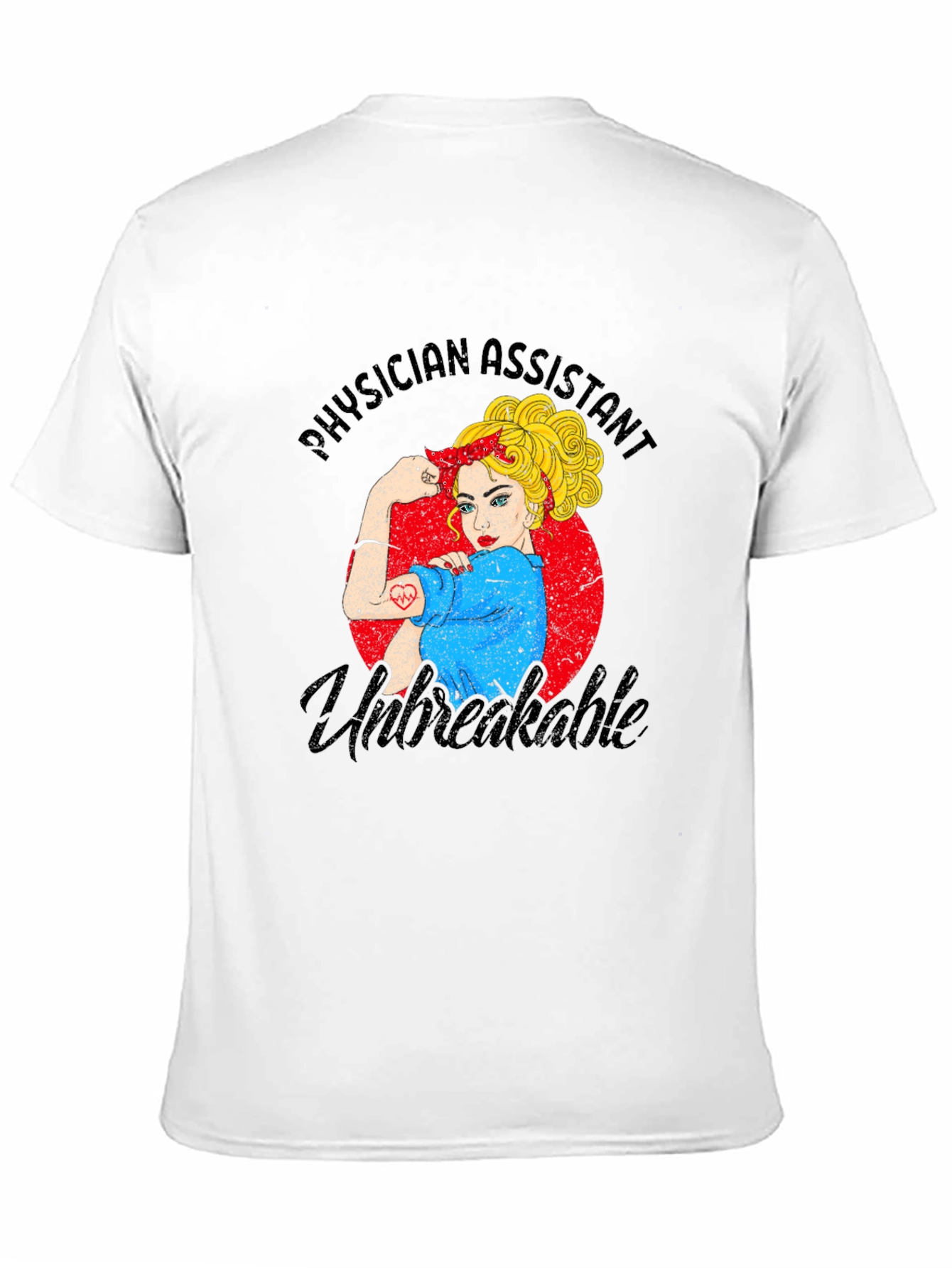 Show your support for hardworking Physician Assistants with this stylish black t-shirt. The design features a vintage-inspired graphic of a strong woman flexing her arm, symbolizing resilience and strength. Emblazoned with "Physician Assistant Unbreakable," this shirt is perfect for wearing on the job, during casual outings, or as a thoughtful gift. The design is set against a red circle that accents the look and feel of the image. Made from comfortable materials, this tee is designed for daily wear.