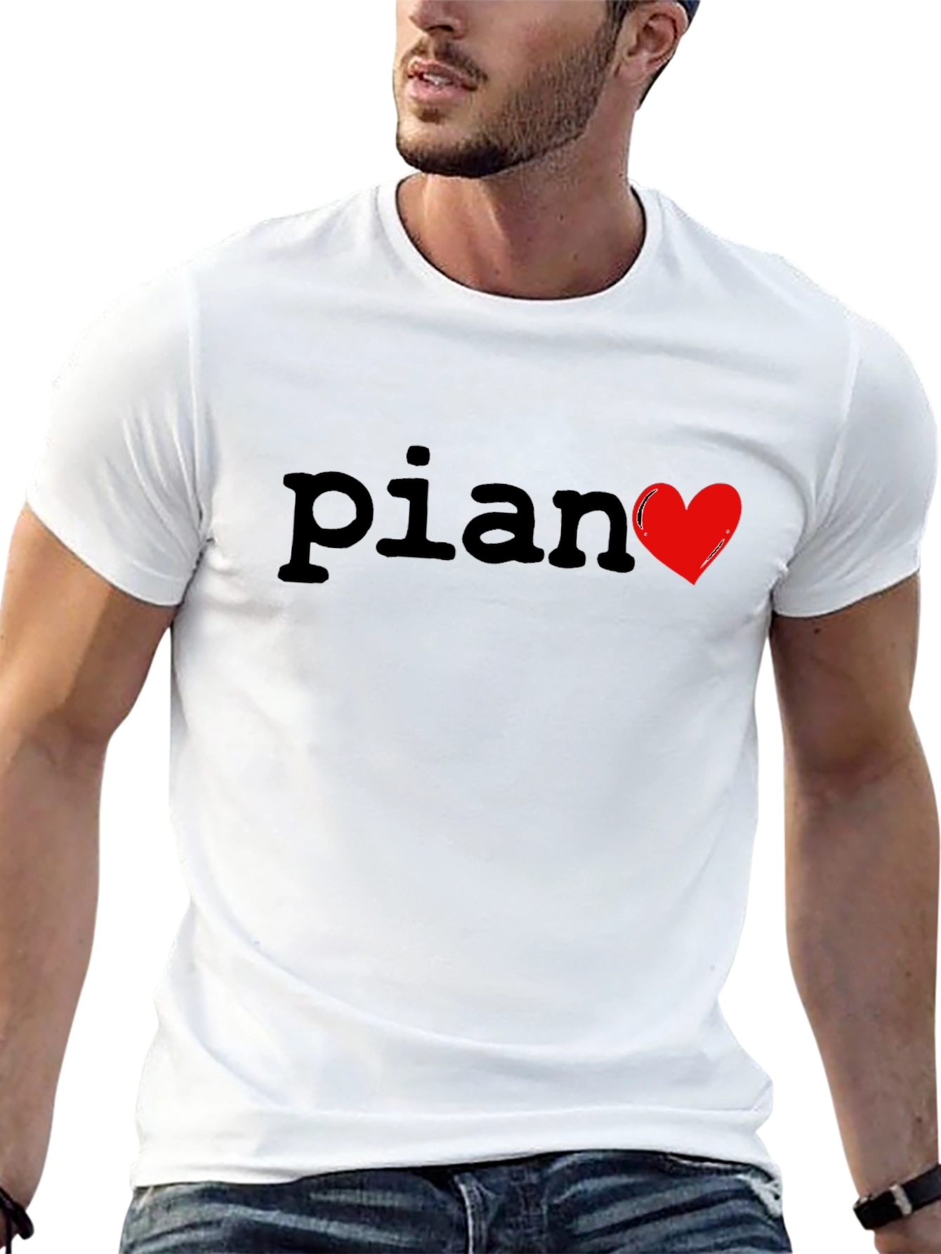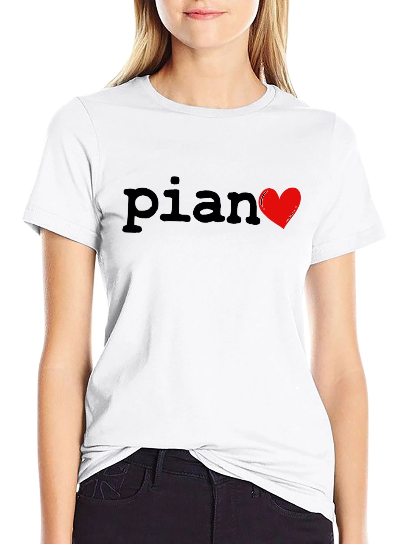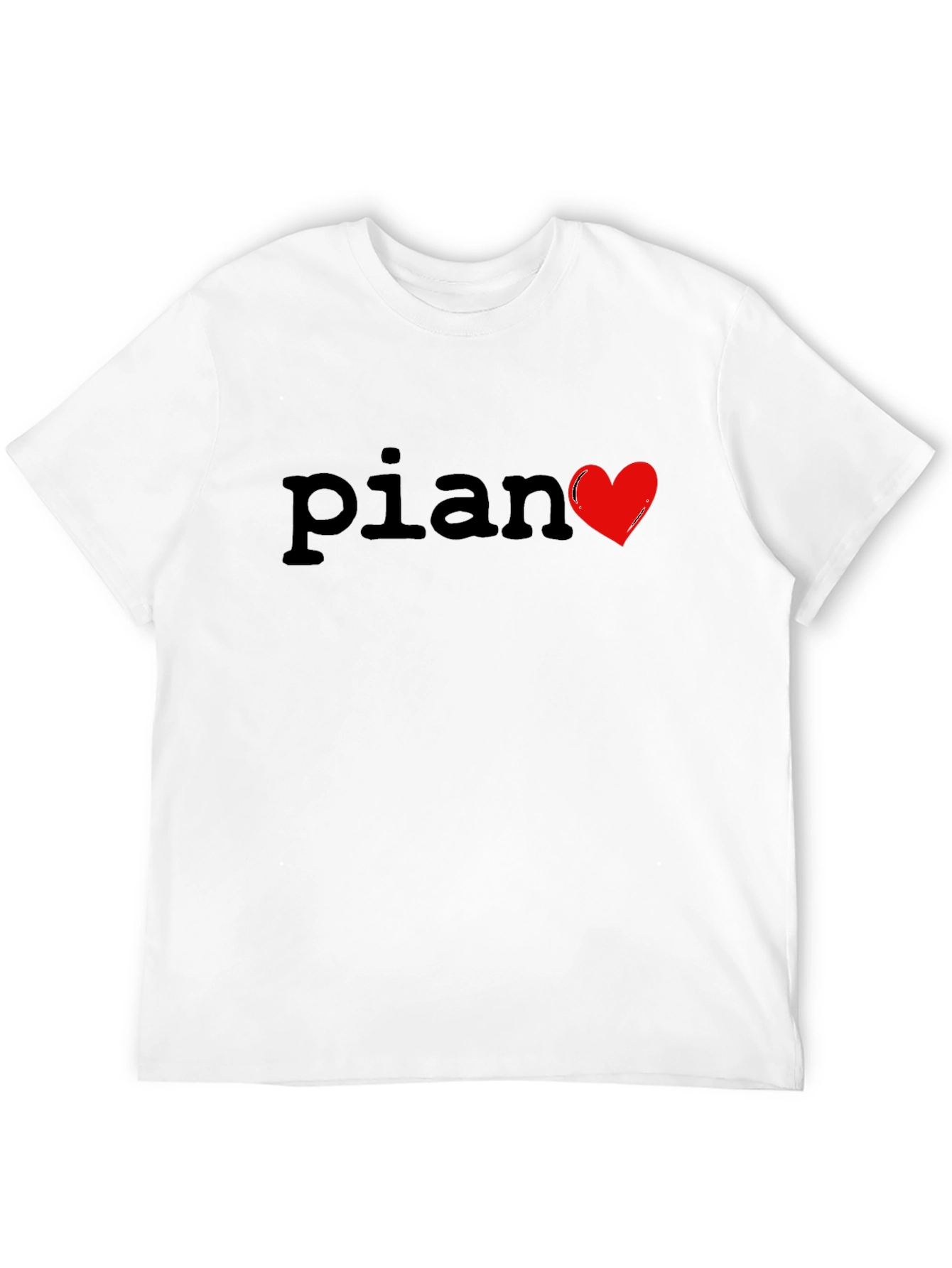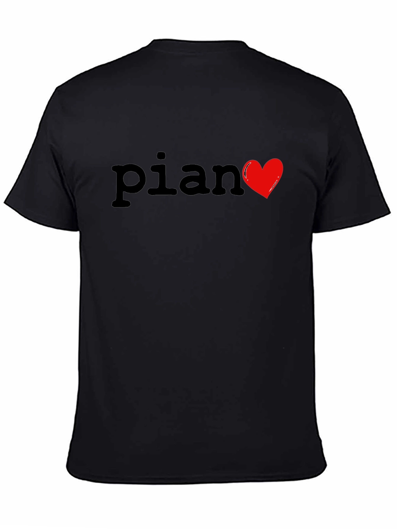 Show your love for music with this stylish black t-shirt. Featuring the word "Piano" with a vibrant red heart replacing the letter "o", this shirt is perfect for musicians and music lovers alike. The shirt appears to be made from a soft, comfortable material, ideal for everyday wear. Its classic fit makes it a versatile addition to any wardrobe. Wear it casually or dress it up - this t-shirt is a great way to express your passion for music wherever you go. A must-have for pianists, music teachers, and fans!