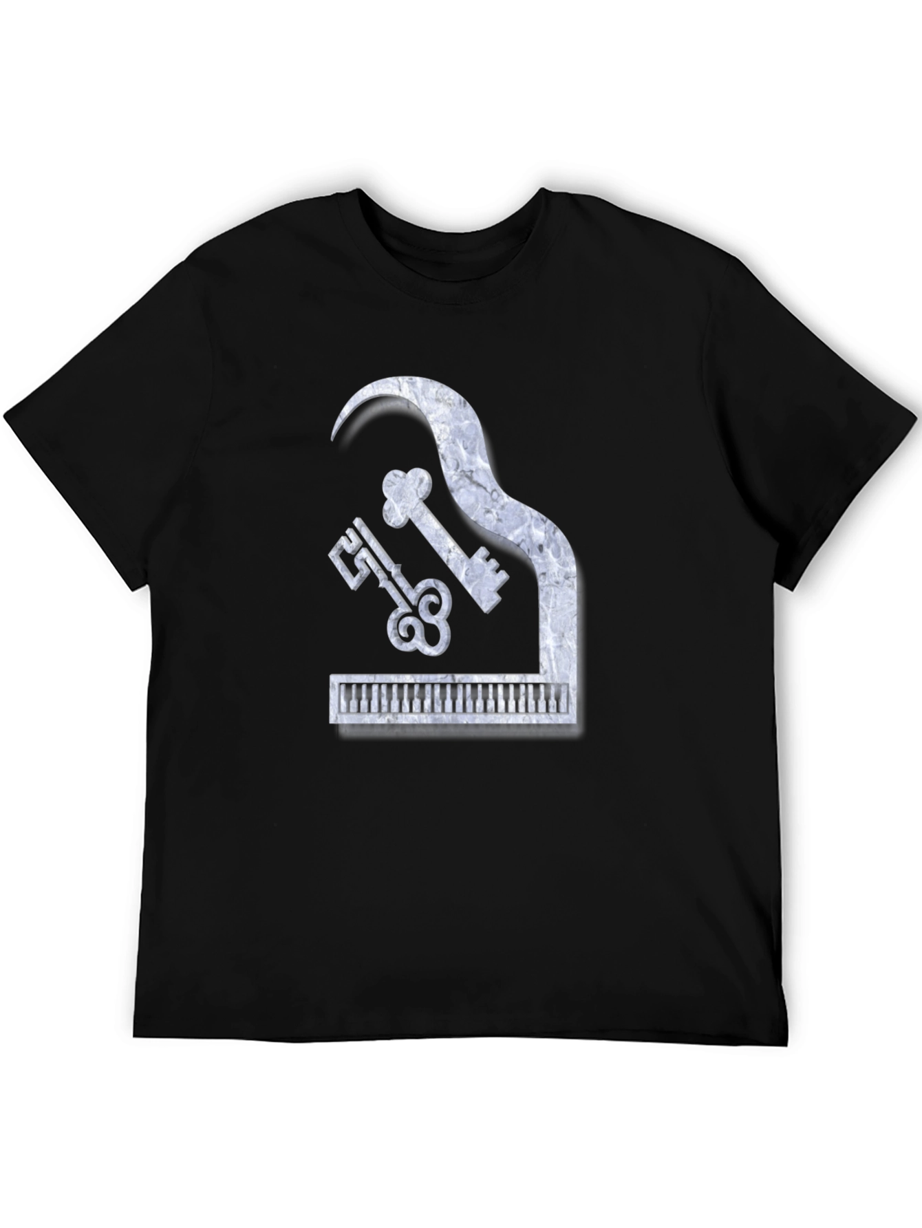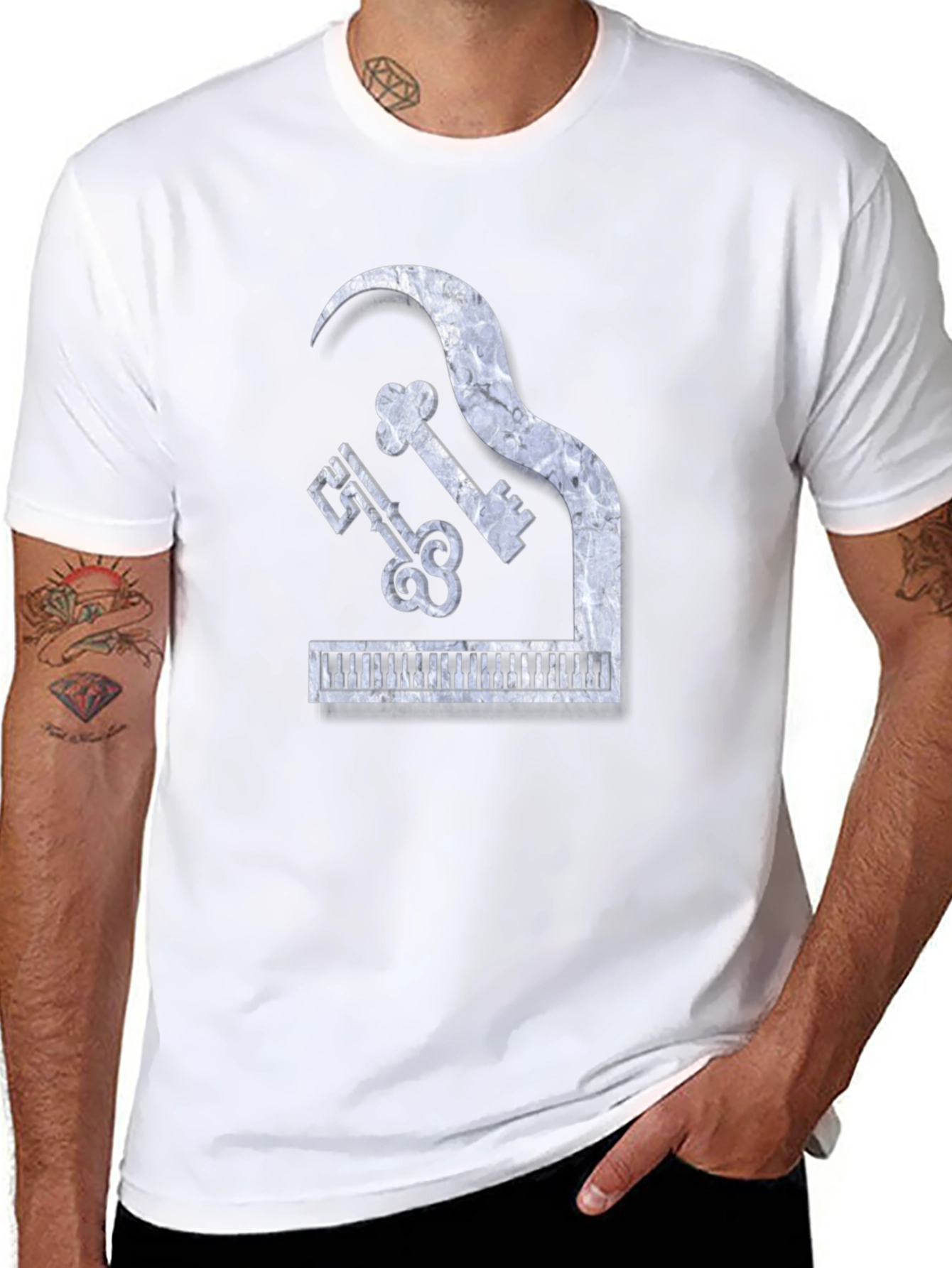 Showcase your love for music with this unique graphic tee. Featuring a striking design that mimics the look of marble, this t-shirt displays stylized piano keys and vintage-inspired keys. The monochromatic color palette offers a modern yet timeless look. Made from a comfortable fabric blend, this tee is perfect for casual wear, music events, or simply expressing your artistic side. Ideal for musicians, music lovers, or anyone who appreciates distinctive design, this t-shirt is sure to turn heads and spark conversations. Pair it with jeans or shorts for a relaxed yet stylish outfit.