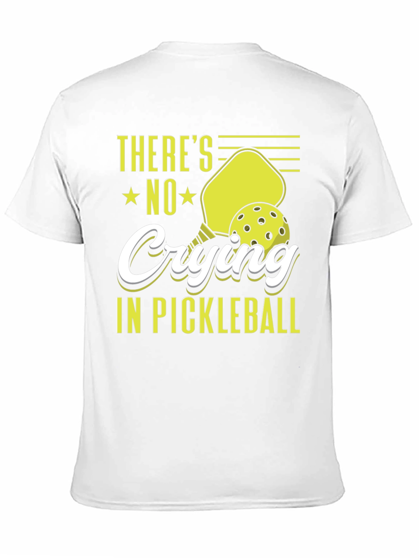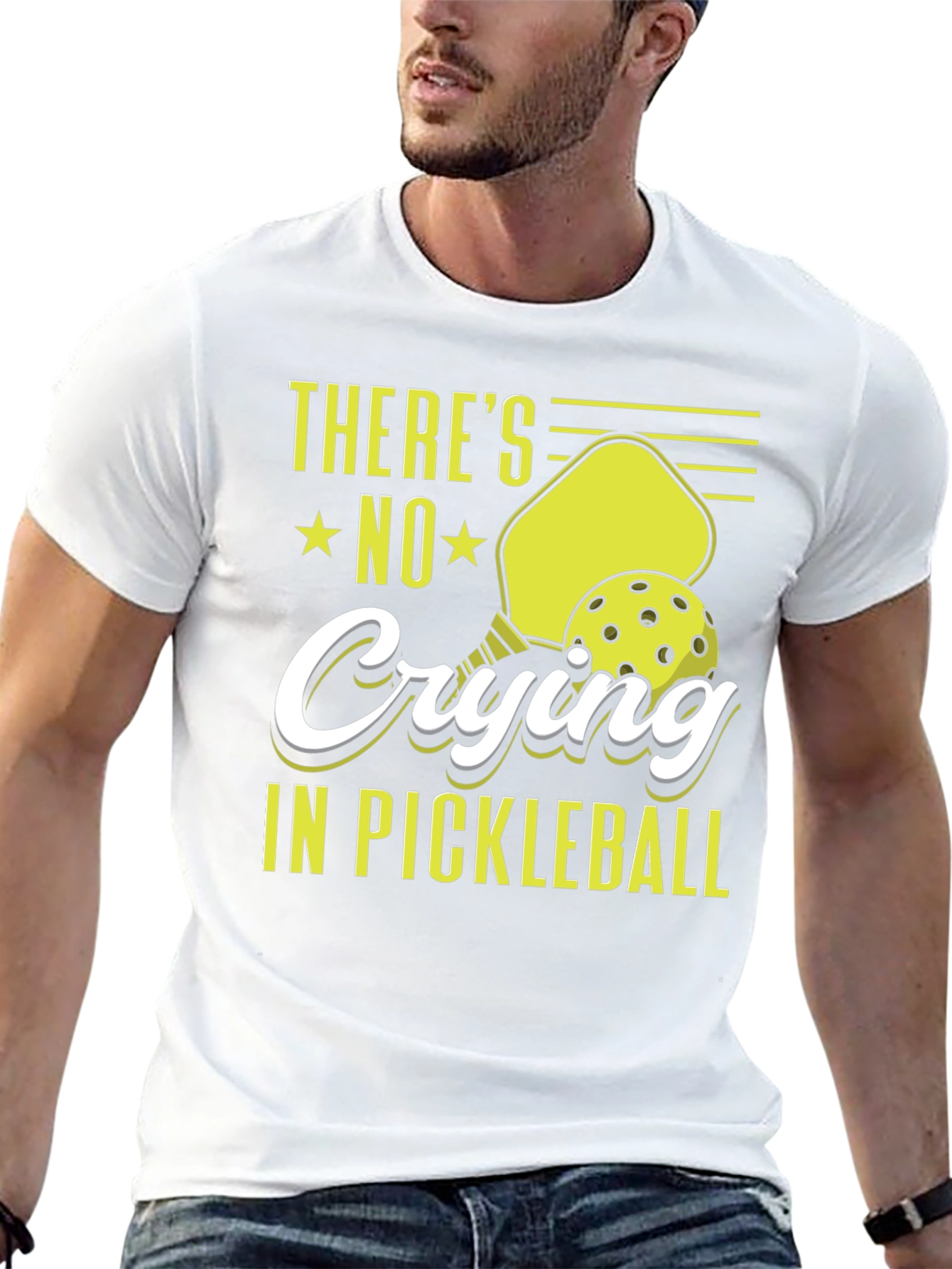 This striking black t-shirt features a humorous and eye-catching graphic for pickleball enthusiasts. The design showcases a paddle and ball with the playful message "There's no crying in pickleball" in bold yellow and white lettering. Made from what appears to be a soft, comfortable cotton blend, this shirt is perfect for wearing on the court, at casual outings, or simply expressing your love for the game. The classic fit and durable construction make it a great addition to any pickleball player's wardrobe. Show off your passion for pickleball with this fun and stylish t-shirt!