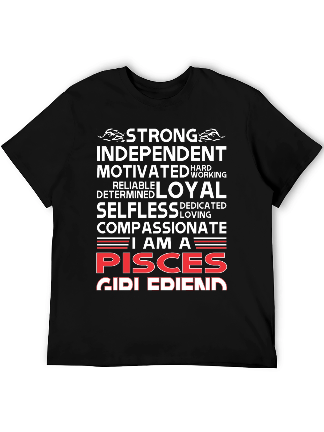 Show off your zodiac pride with this stylish black T-shirt. Featuring a bold, eye-catching design, the shirt declares 'I AM A PISCES' in vibrant red, complemented by white text highlighting positive traits such as strong, independent, motivated, loyal, and compassionate. This tee is perfect for casual wear, allowing you to express your personality and connect with fellow astrology enthusiasts. Made from comfortable materials, it's ideal for everyday use, making a statement while ensuring comfort. A great gift for any Pisces!