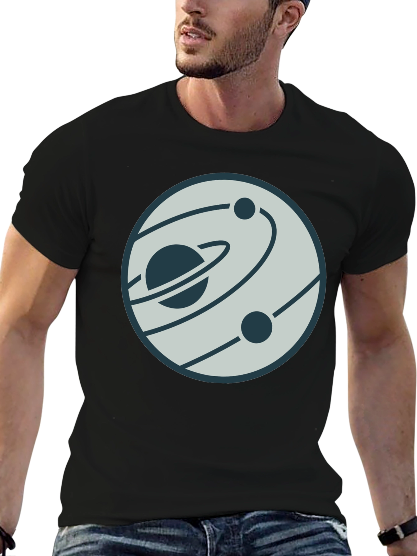 Explore the cosmos with this stylish black graphic tee. Featuring a bold circular design with a unique planetary system, it's perfect for astronomy enthusiasts and trendsetters alike. The design showcases a central planet with rings and two orbiting celestial bodies on a grey background, giving it a modern and eye-catching appeal. Made from a soft, comfortable fabric, this unisex t-shirt offers a relaxed fit for all-day wear. Whether you're heading out with friends, relaxing at home, or want to show off your love for space, this tee is the perfect choice. Add a touch of cosmic style to your wardrobe today!