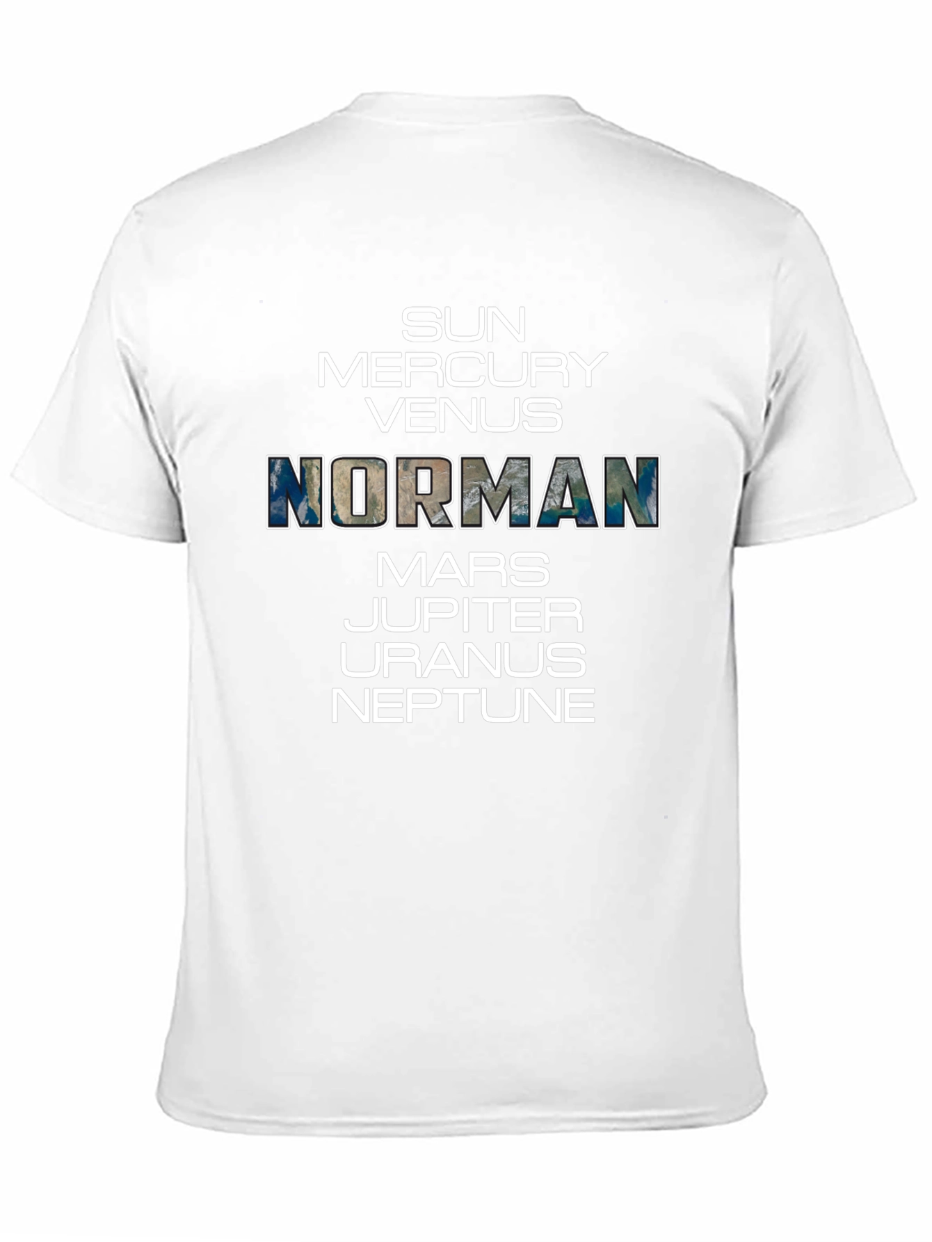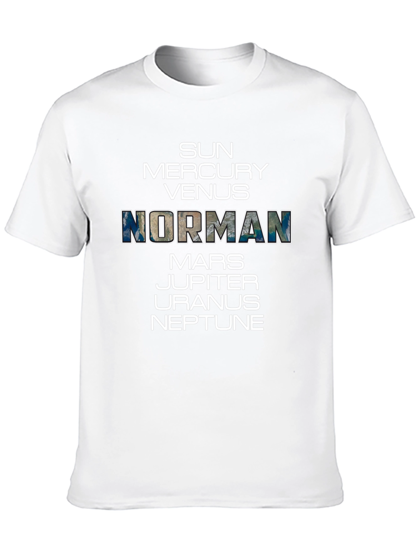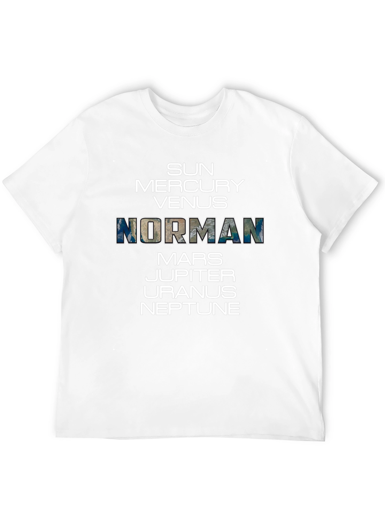Show off your love for the solar system with this unique planetary t-shirt! This stylish black tee features a list of planets in our solar system. The design includes the Sun, Mercury, Venus, with the Earth creatively replaced by "NORMAN", followed by Mars, Jupiter, Uranus, and Neptune. The text is in a crisp, white sans-serif font, except for "NORMAN" which boasts an Earth-like graphic fill. Perfect for casual wear or making a statement at astronomy events.