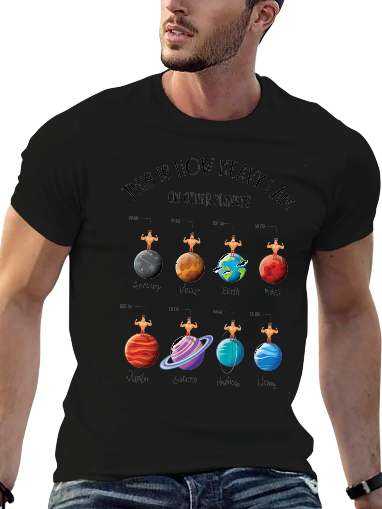 Explore the cosmos with this unique black t-shirt featuring a playful "This is How Heavy I Am On Other Planets" design. The shirt showcases colorful illustrations of planets like Mercury, Venus, Earth, Mars, Jupiter, Saturn, Neptune, and Uranus, each humorously depicted with a weightlifter on top, indicating relative gravitational pull. Made from a soft, comfortable fabric, this tee is perfect for astronomy enthusiasts, science lovers, or anyone with a quirky sense of humor. Wear it casually, to science events, or simply to spark conversations about the wonders of space. A must-have for your wardrobe or a gift for a space geek!