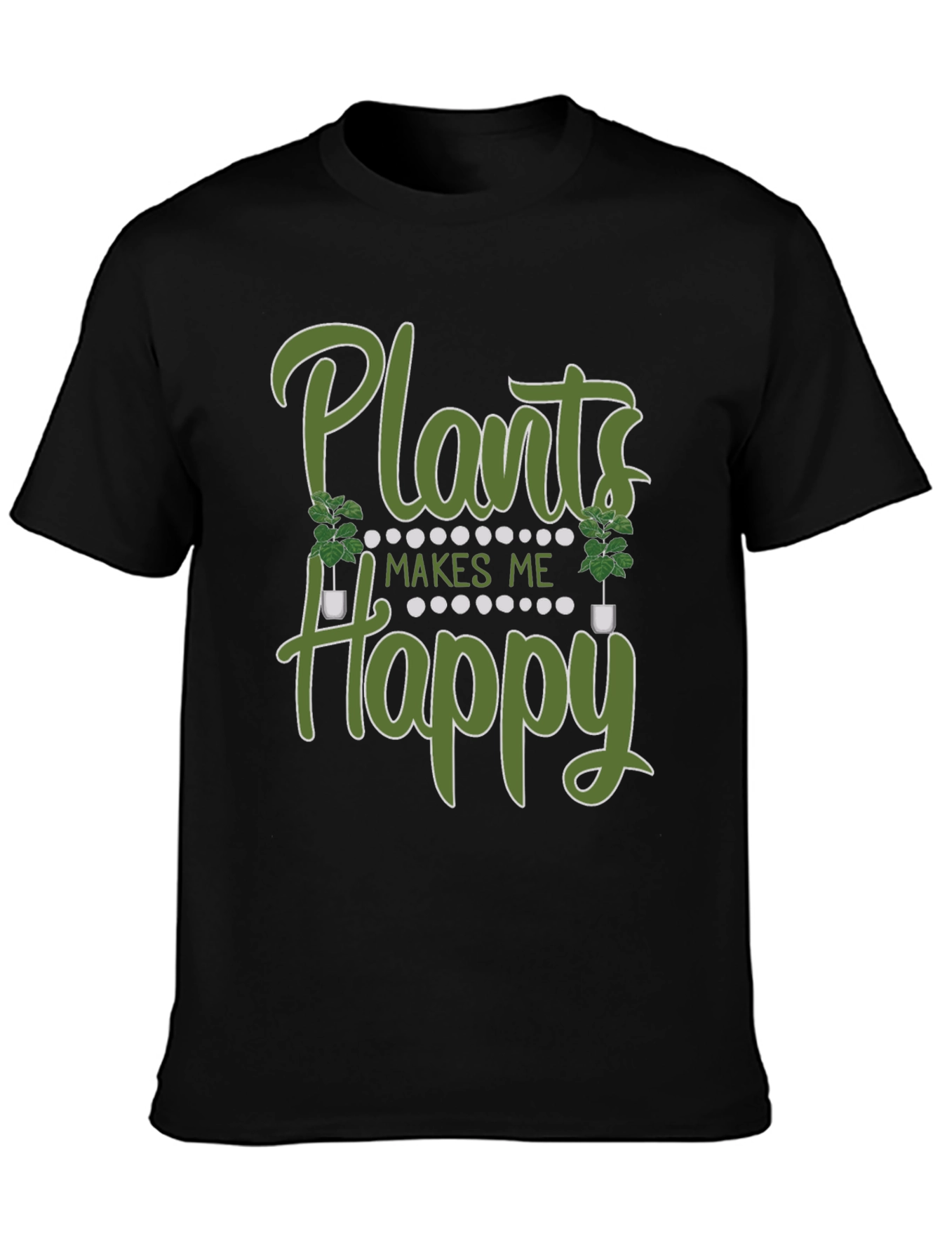 Show off your love for plants with this stylish and comfortable black t-shirt. The design features the phrase "Plants Makes Me Happy" in a playful green font, complemented by charming plant illustrations. Crafted from soft, breathable fabric, this tee is perfect for everyday wear, whether you're gardening, running errands, or just relaxing at home. Its classic fit makes it a versatile addition to any wardrobe. Spread some joy and plant appreciation wherever you go with this eye-catching t-shirt!